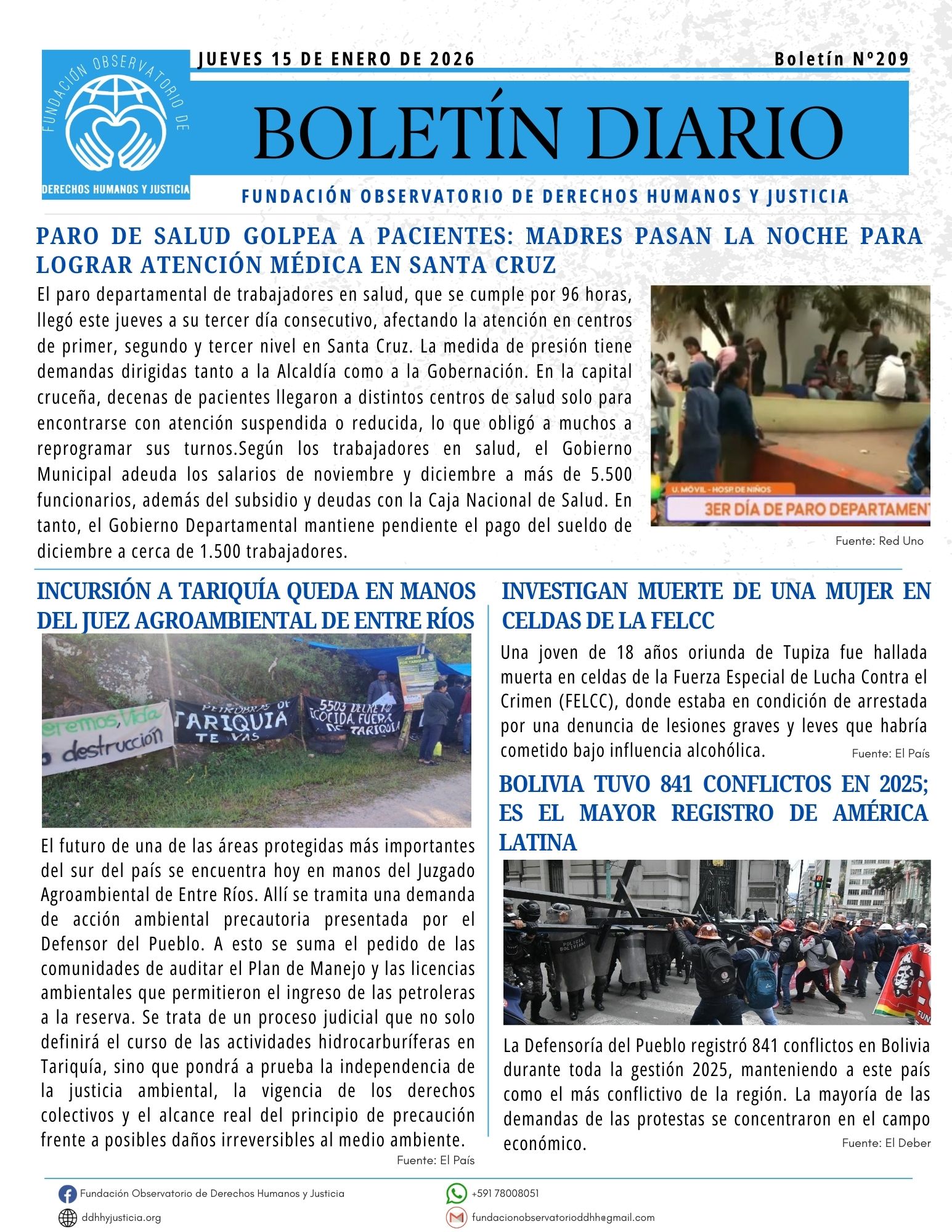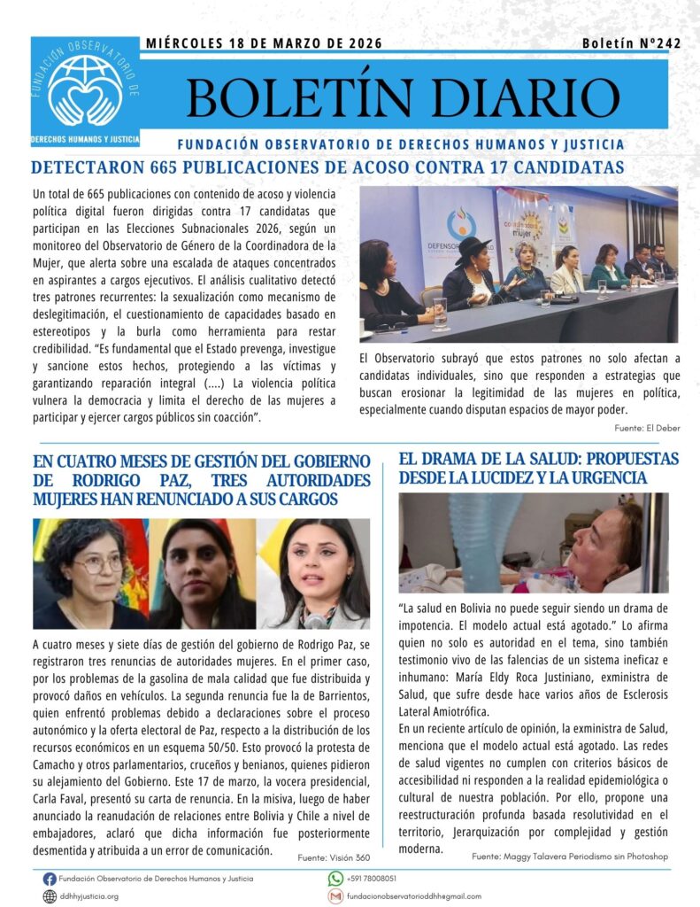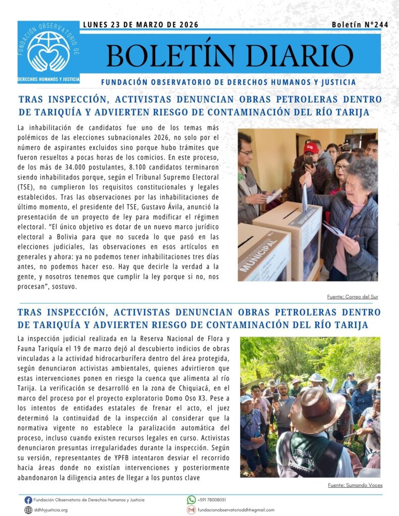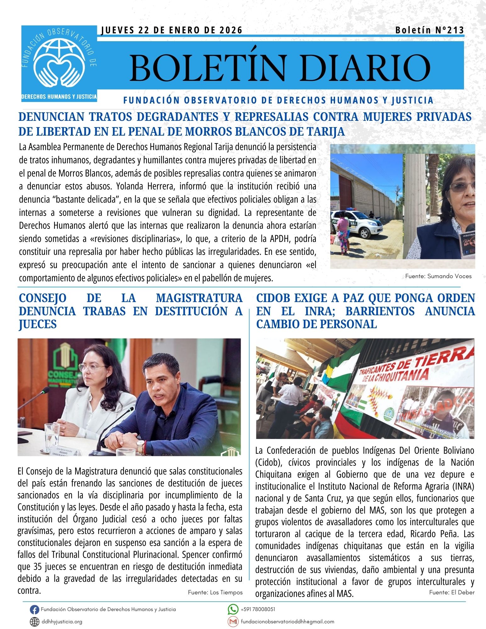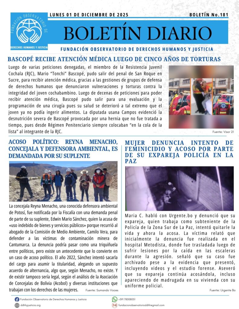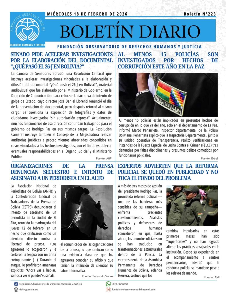 Desarrollamos nuestras actividades para que las frecuentes denuncias de violaciones de derechos humanos conocidas a través de diversos medios de prensa e instituciones que tienen los mismos objetivos, puedan visibilizarse y denunciarse. Para ello llevamos adelante un trabajo de monitoreo, investigación, observación y formación en derechos humanos, que nos permite conocer el estado real de la observancia y respeto de los derechos civiles y políticos en Bolivia.