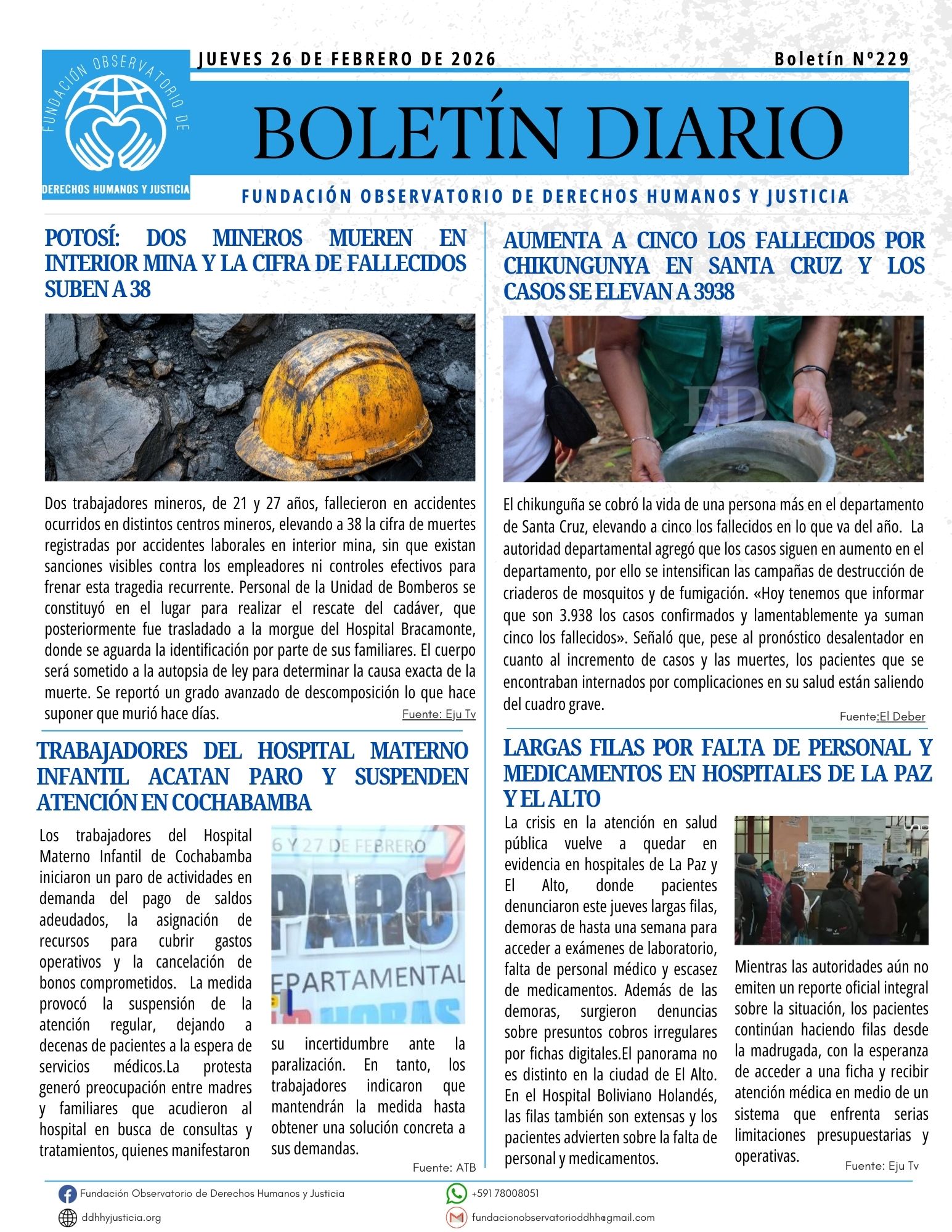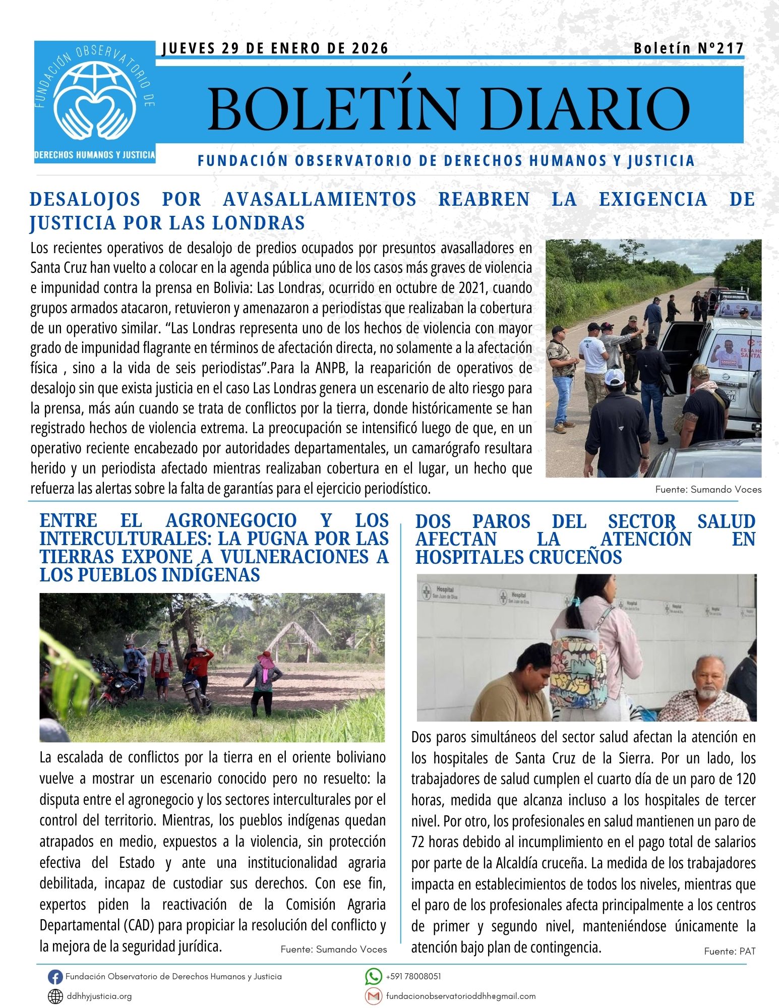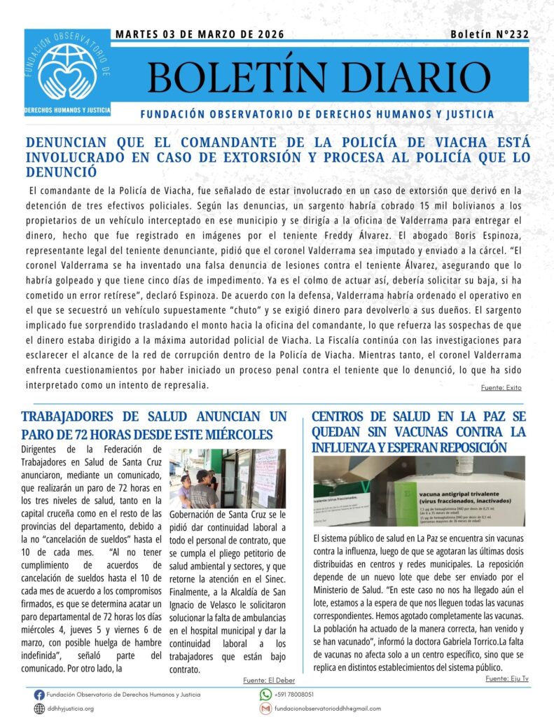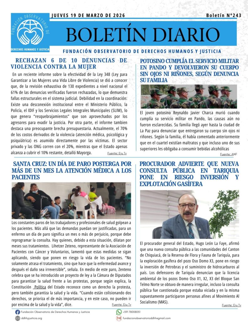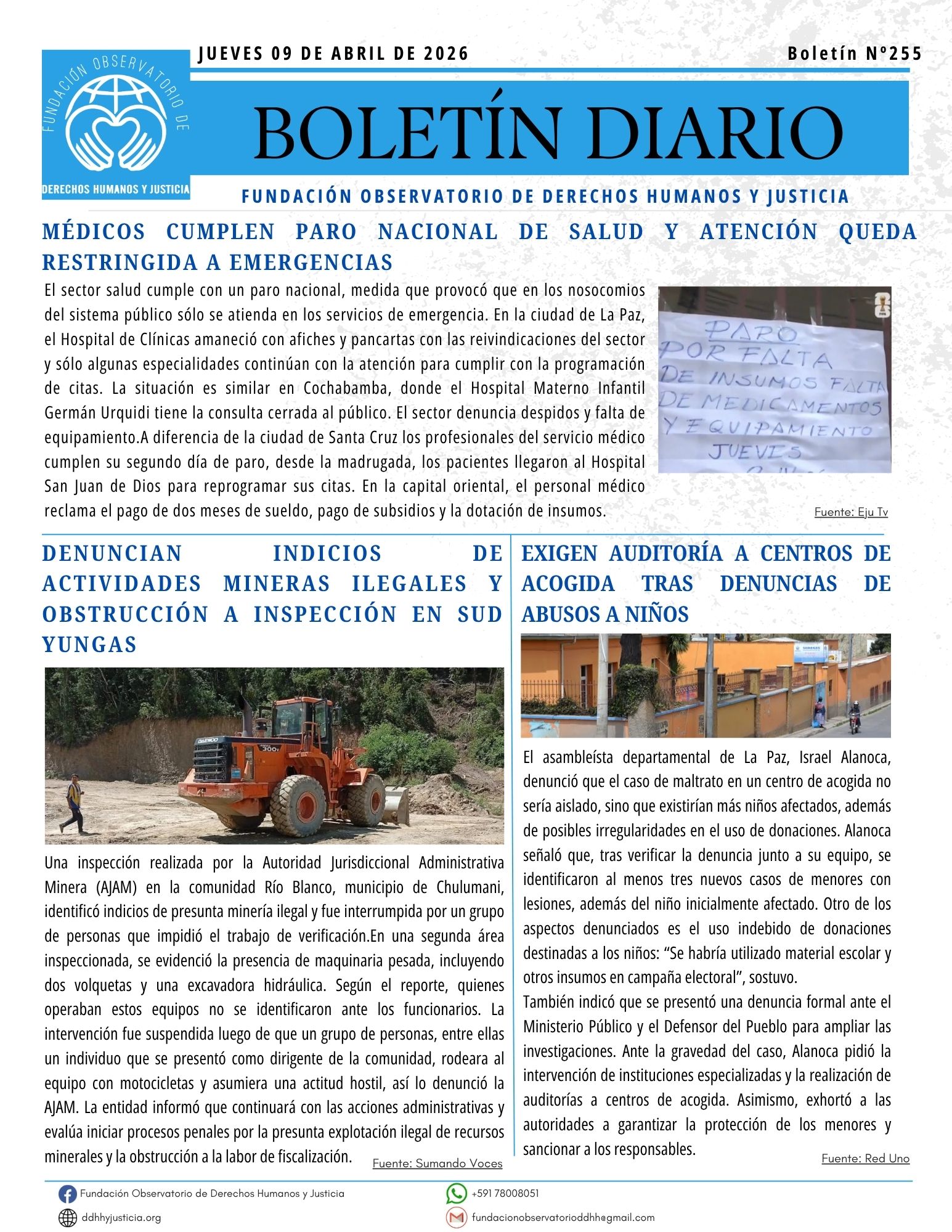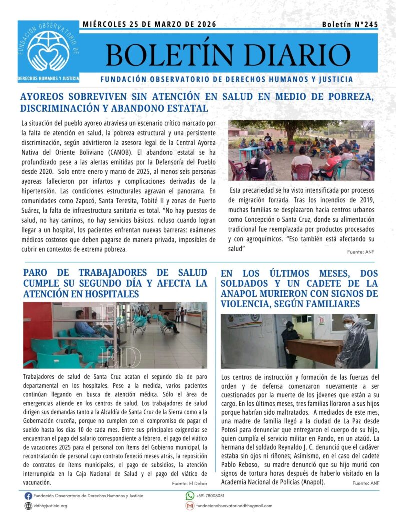 Desarrollamos nuestras actividades para que las frecuentes denuncias de violaciones de derechos humanos conocidas a través de diversos medios de prensa e instituciones que tienen los mismos objetivos, puedan visibilizarse y denunciarse. Para ello llevamos adelante un trabajo de monitoreo, investigación, observación y formación en derechos humanos, que nos permite conocer el estado real de la observancia y respeto de los derechos civiles y políticos en Bolivia.