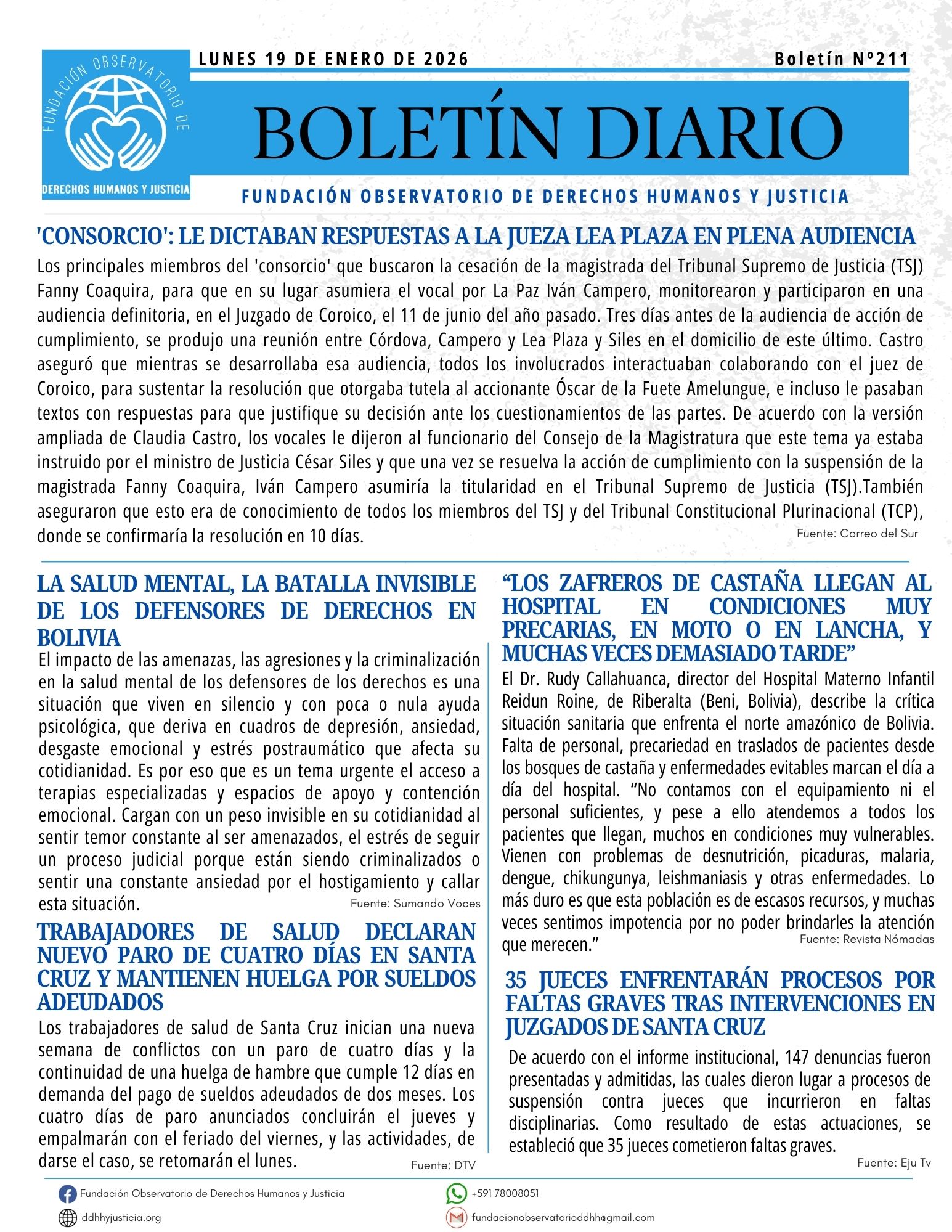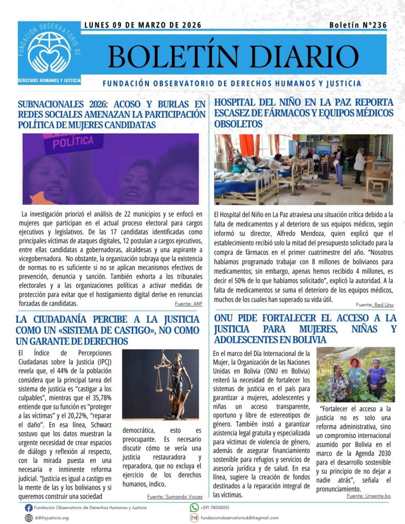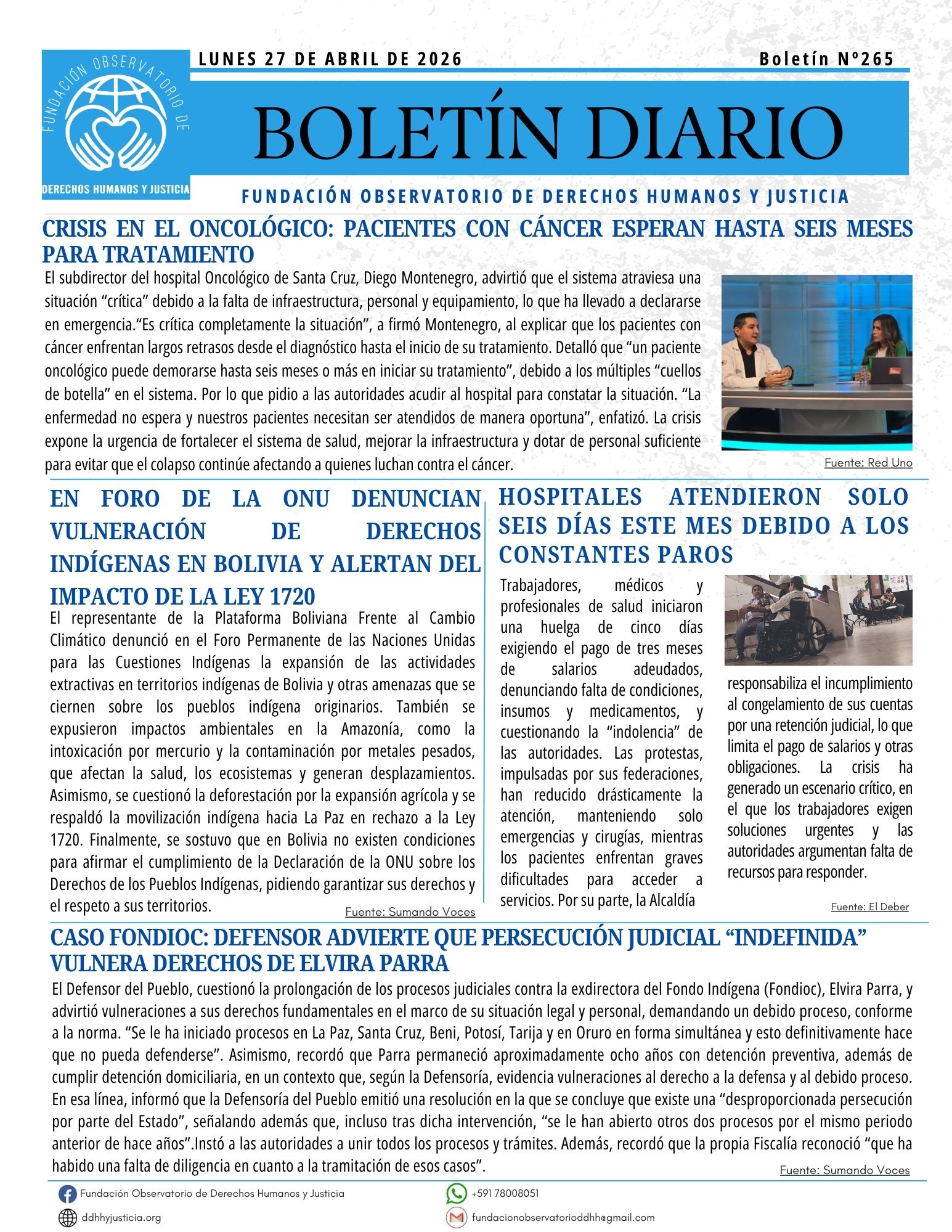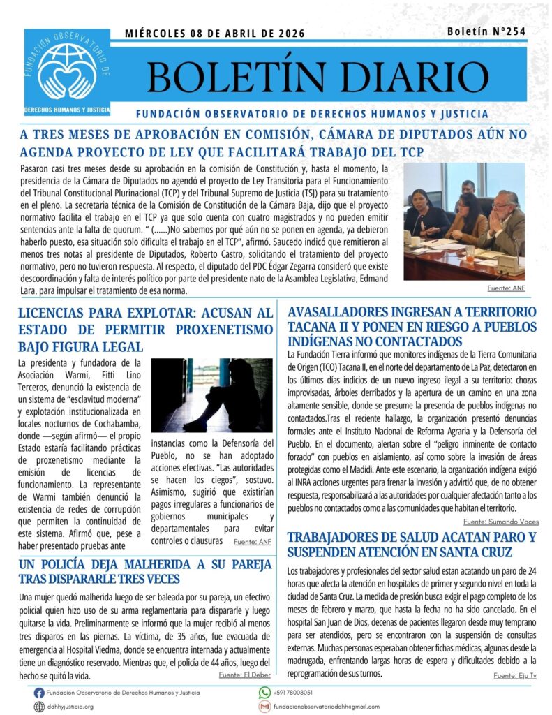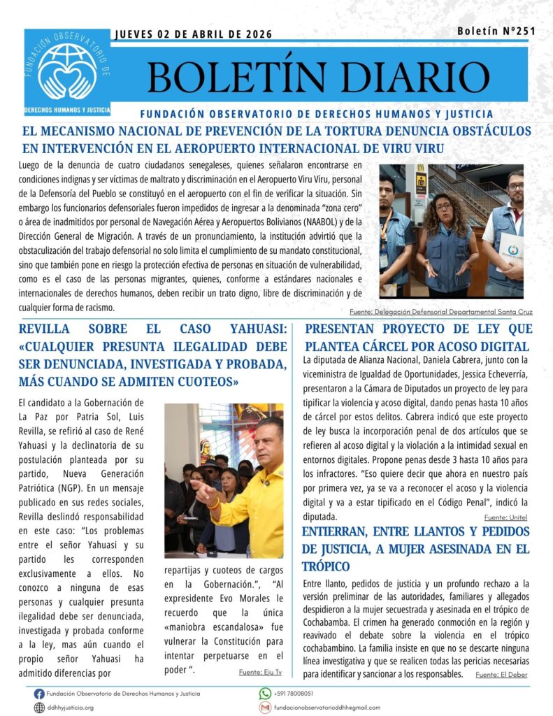 Desarrollamos nuestras actividades para que las frecuentes denuncias de violaciones de derechos humanos conocidas a través de diversos medios de prensa e instituciones que tienen los mismos objetivos, puedan visibilizarse y denunciarse. Para ello llevamos adelante un trabajo de monitoreo, investigación, observación y formación en derechos humanos, que nos permite conocer el estado real de la observancia y respeto de los derechos civiles y políticos en Bolivia.