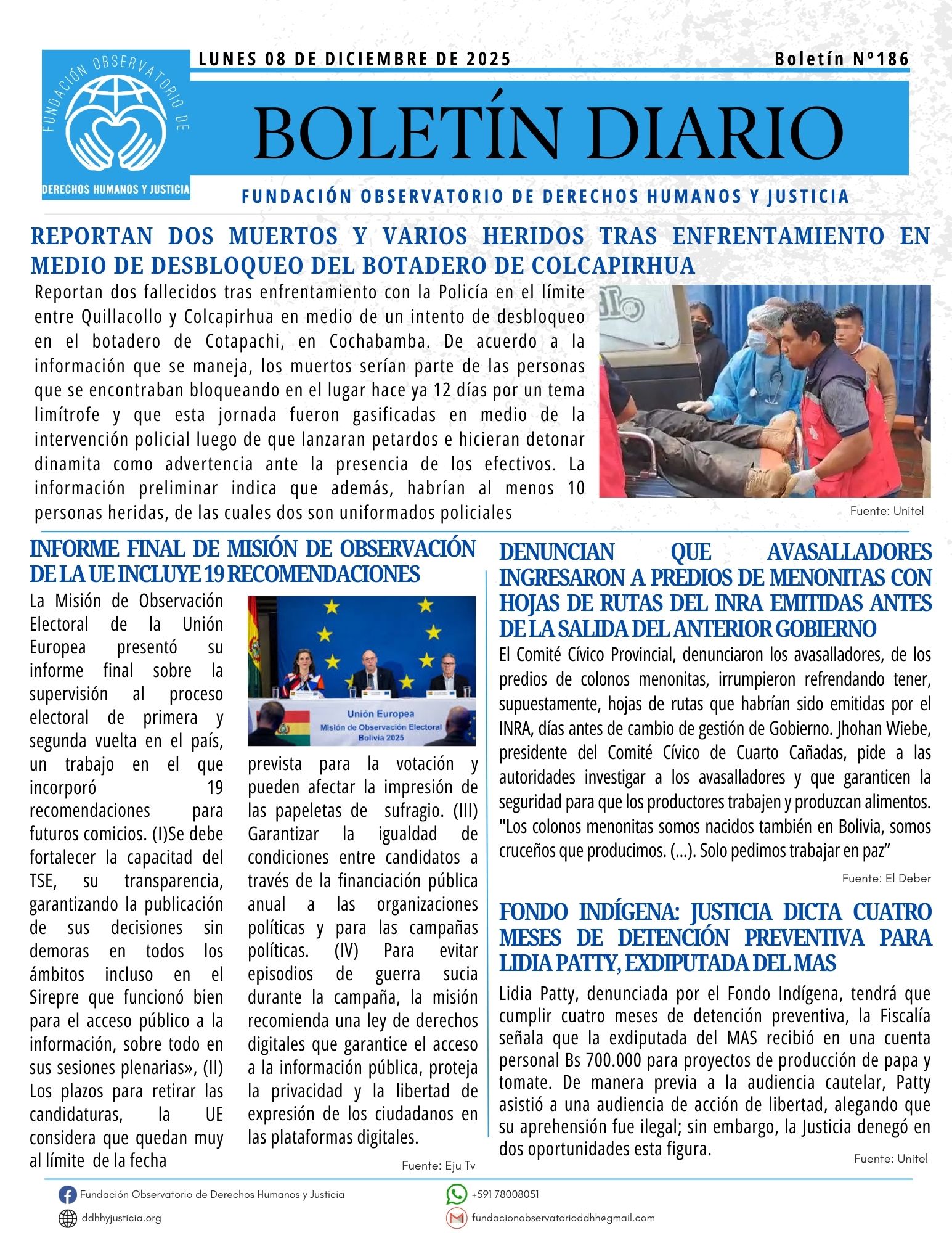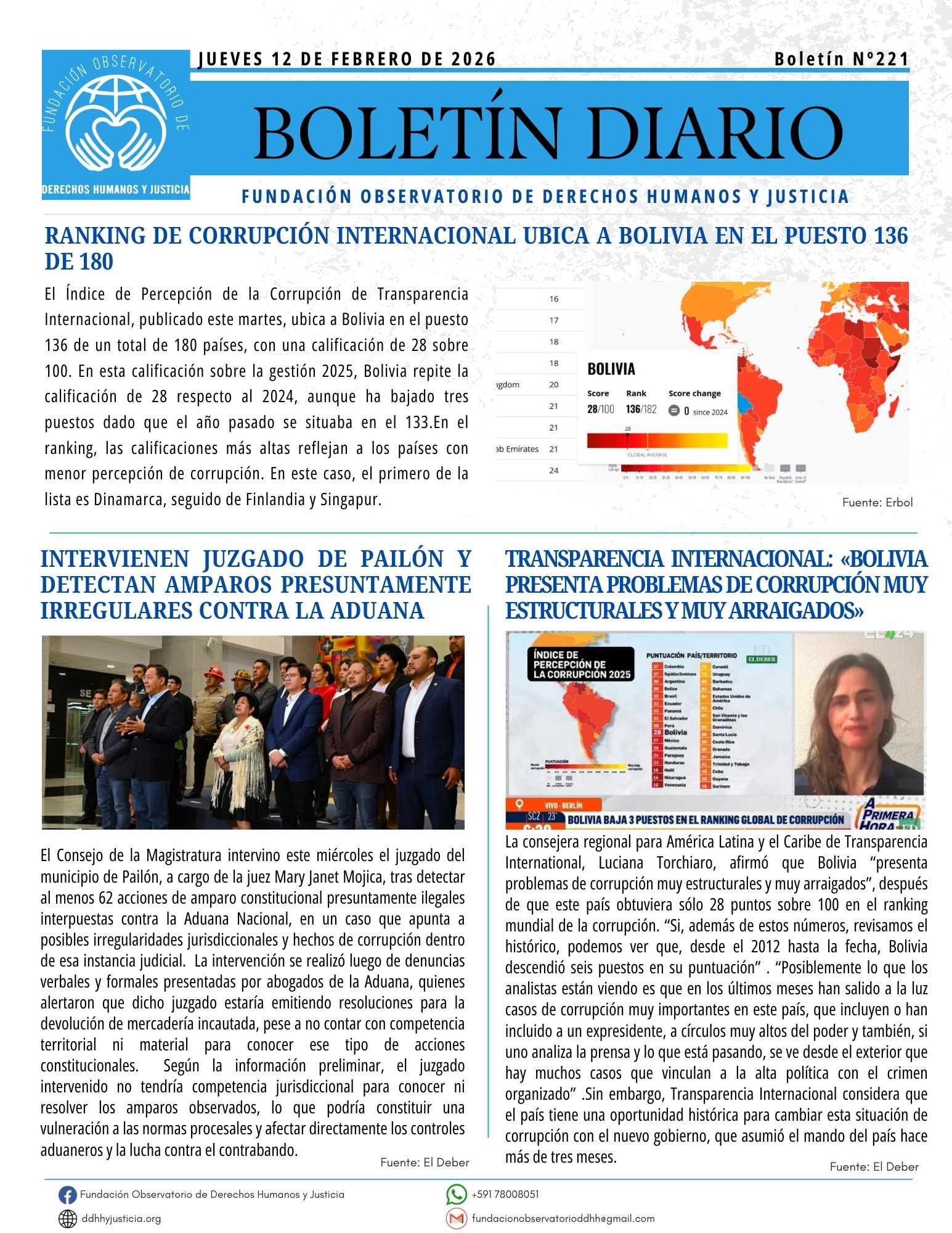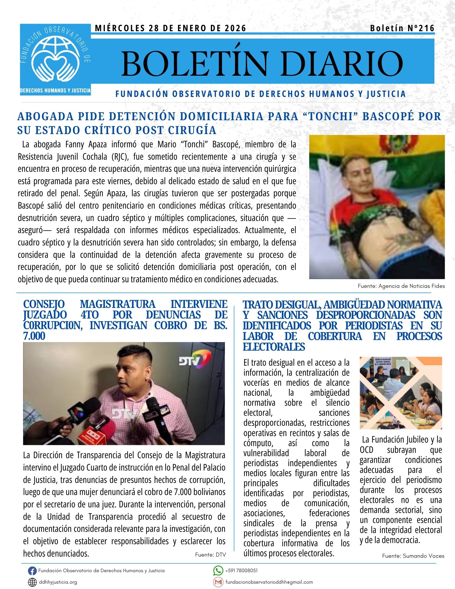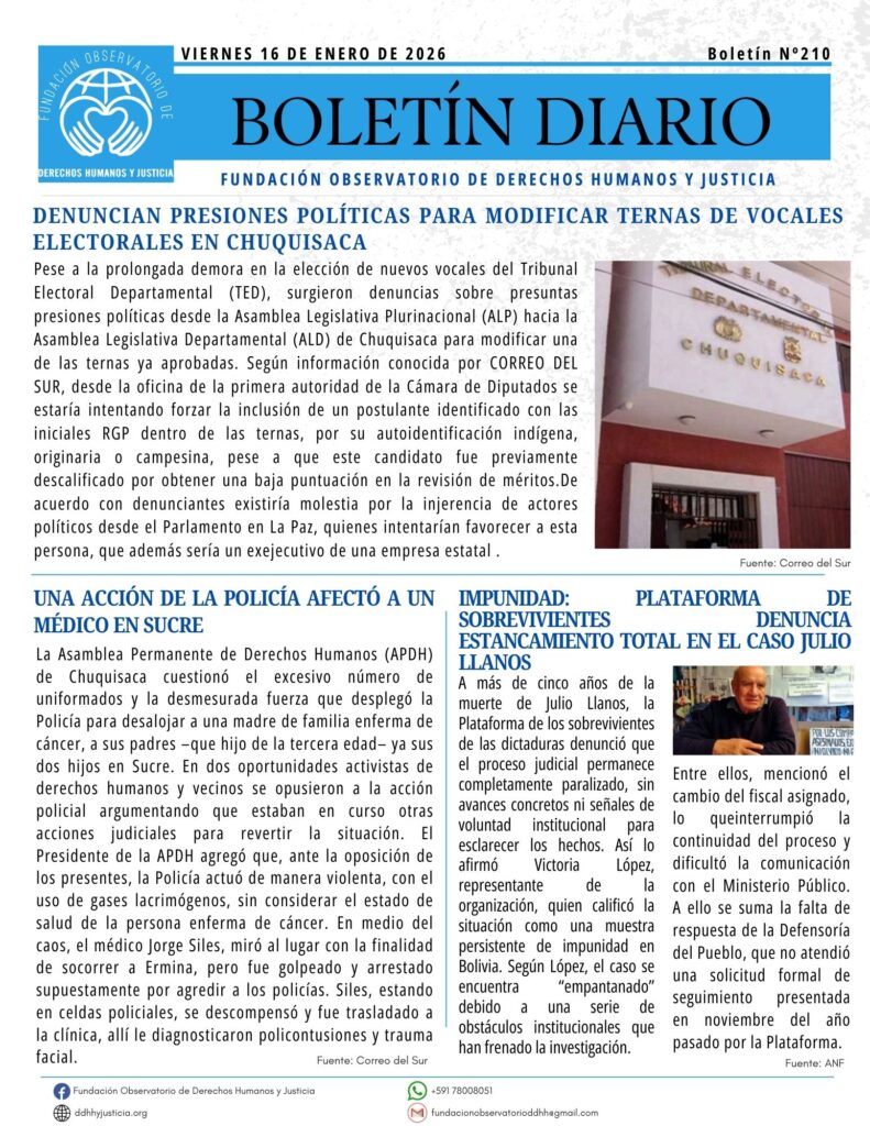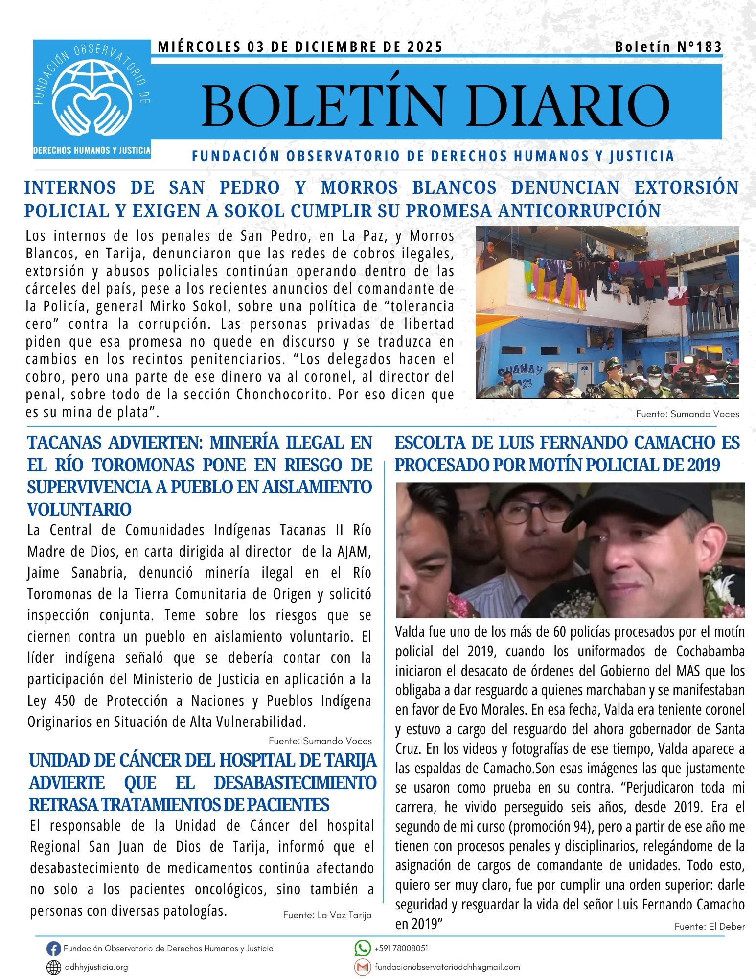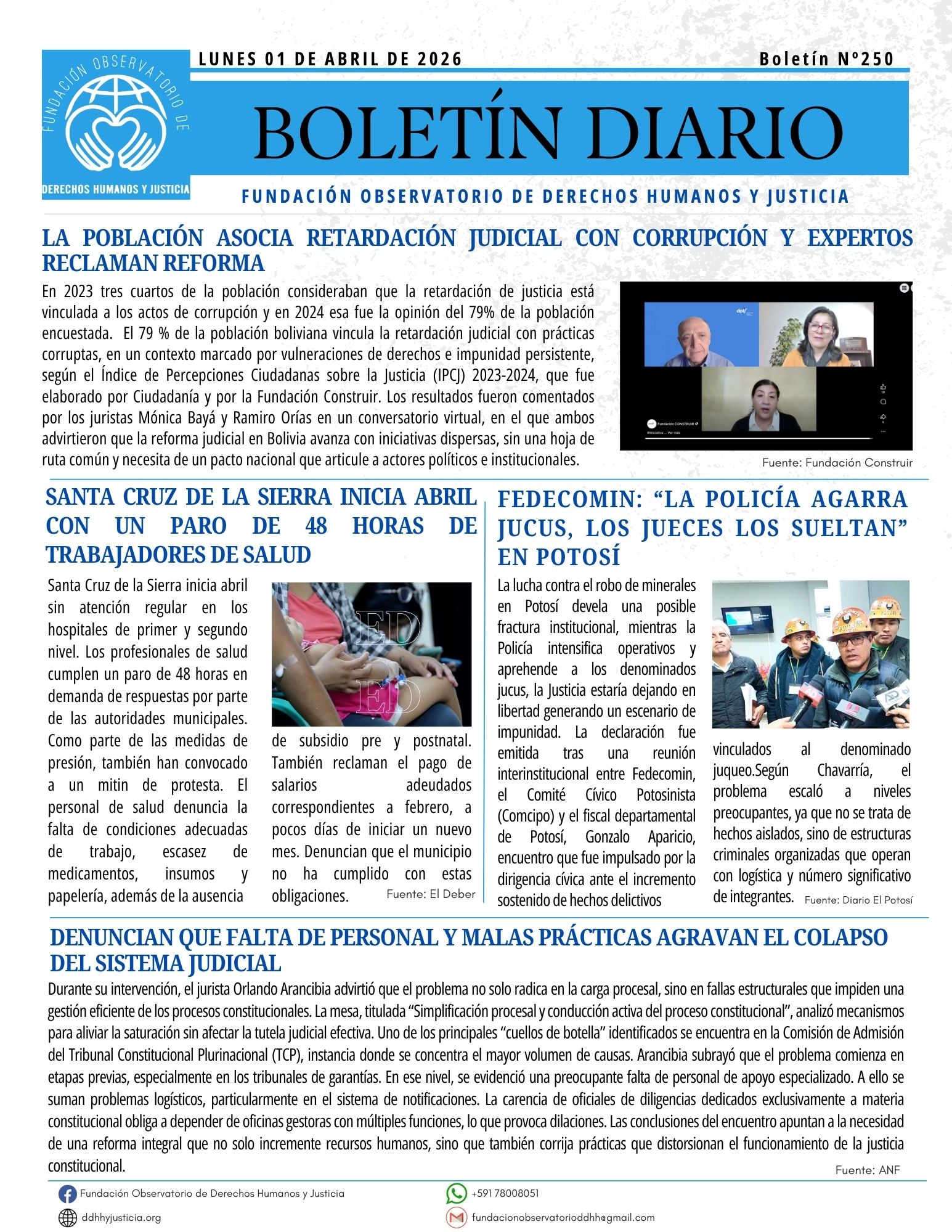 Desarrollamos nuestras actividades para que las frecuentes denuncias de violaciones de derechos humanos conocidas a través de diversos medios de prensa e instituciones que tienen los mismos objetivos, puedan visibilizarse y denunciarse. Para ello llevamos adelante un trabajo de monitoreo, investigación, observación y formación en derechos humanos, que nos permite conocer el estado real de la observancia y respeto de los derechos civiles y políticos en Bolivia.