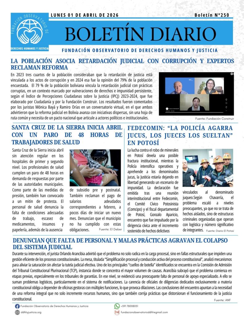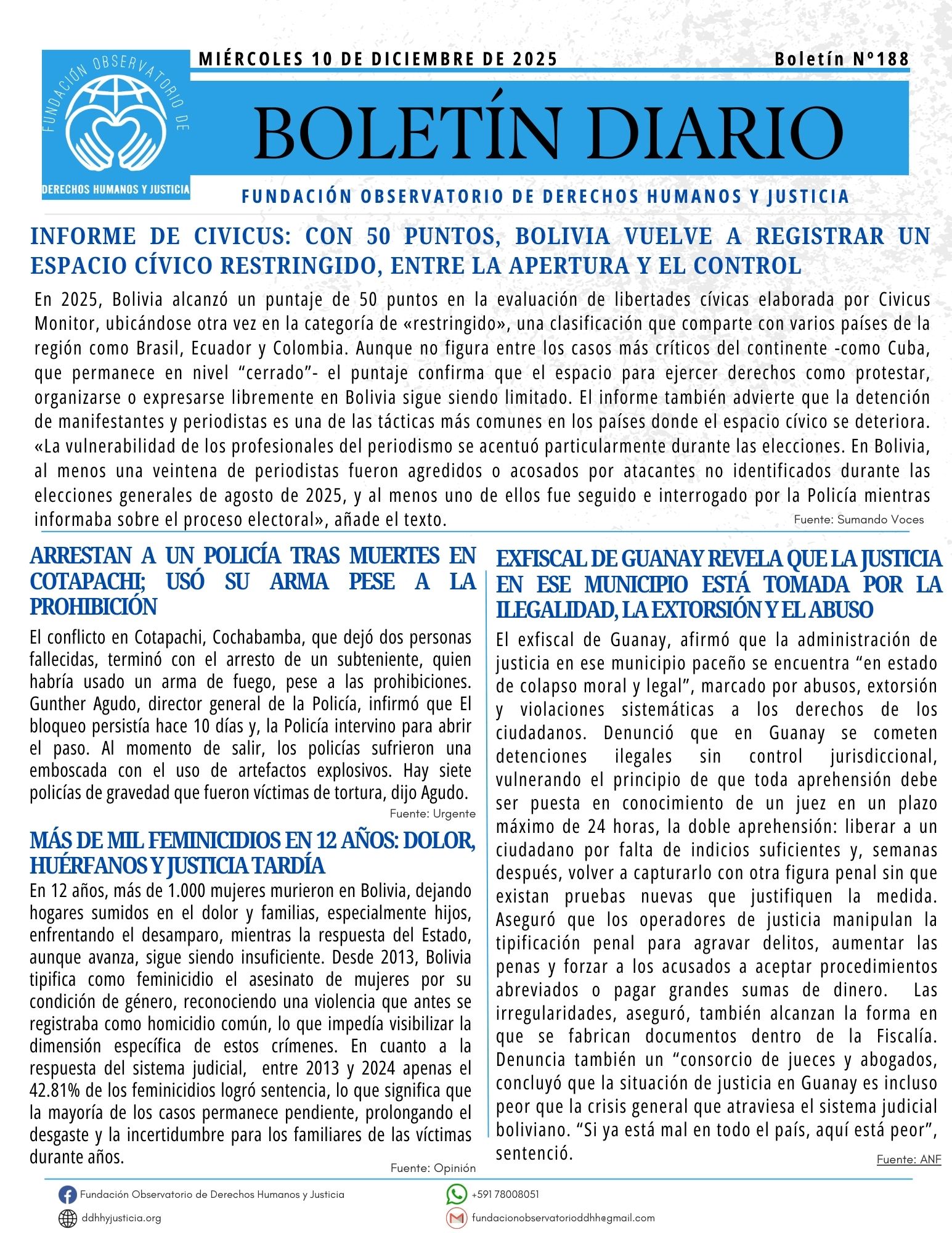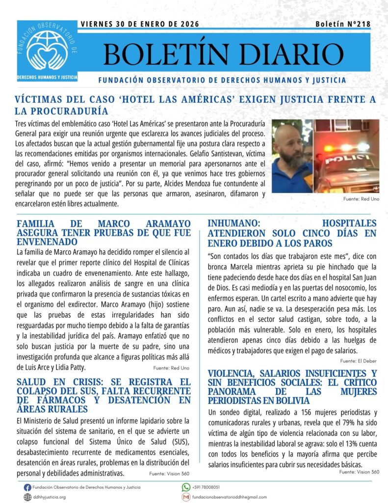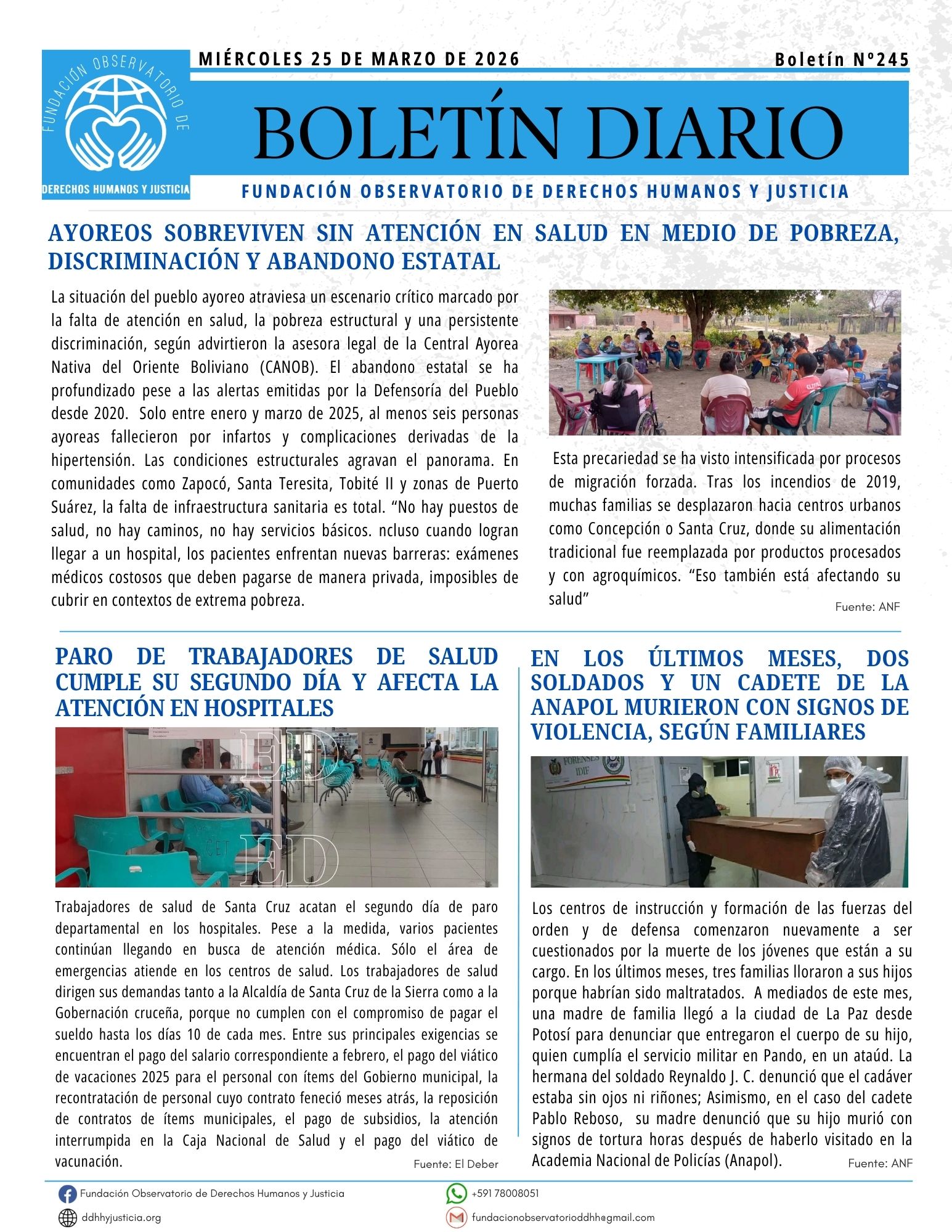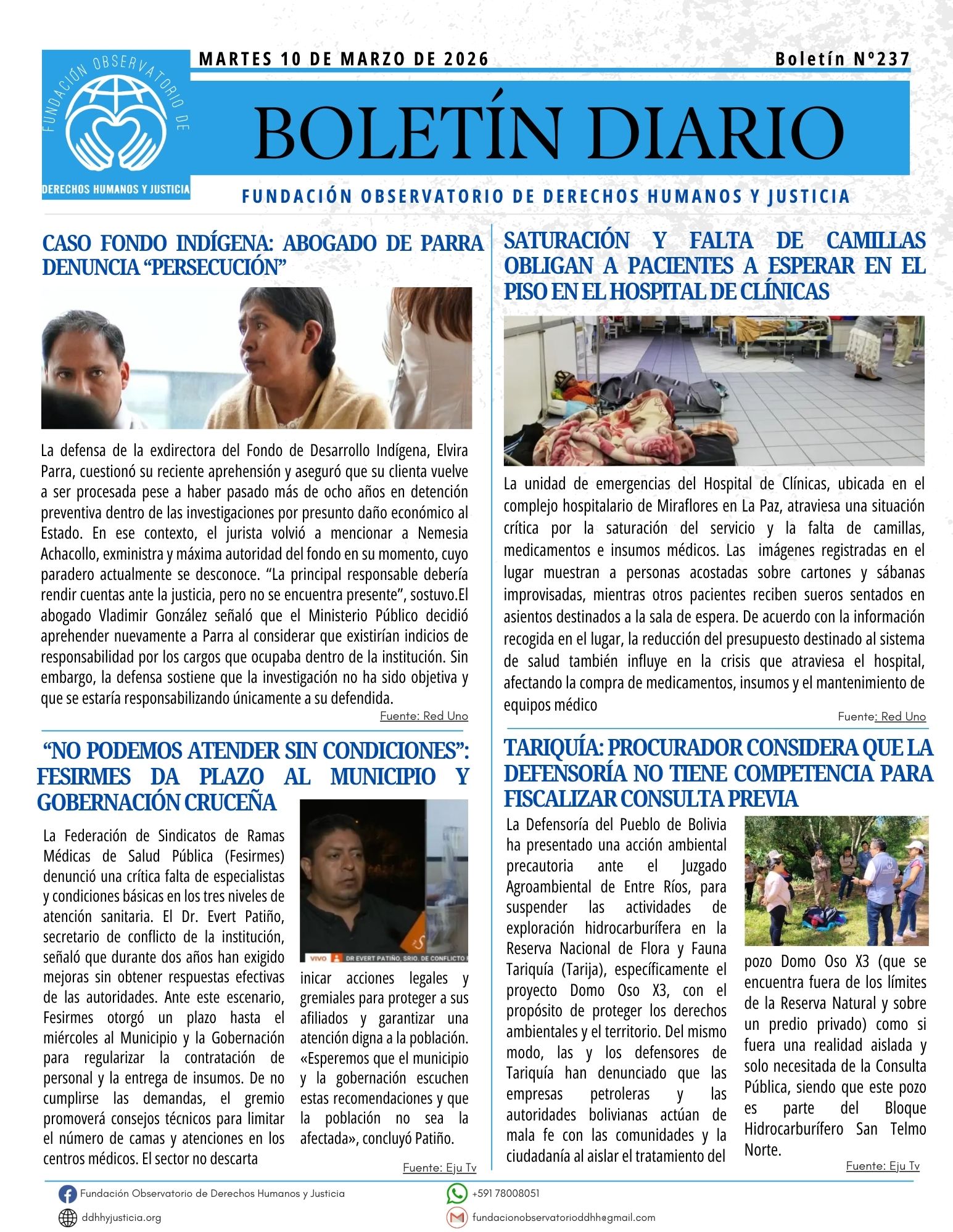 Desarrollamos nuestras actividades para que las frecuentes denuncias de violaciones de derechos humanos conocidas a través de diversos medios de prensa e instituciones que tienen los mismos objetivos, puedan visibilizarse y denunciarse. Para ello llevamos adelante un trabajo de monitoreo, investigación, observación y formación en derechos humanos, que nos permite conocer el estado real de la observancia y respeto de los derechos civiles y políticos en Bolivia.