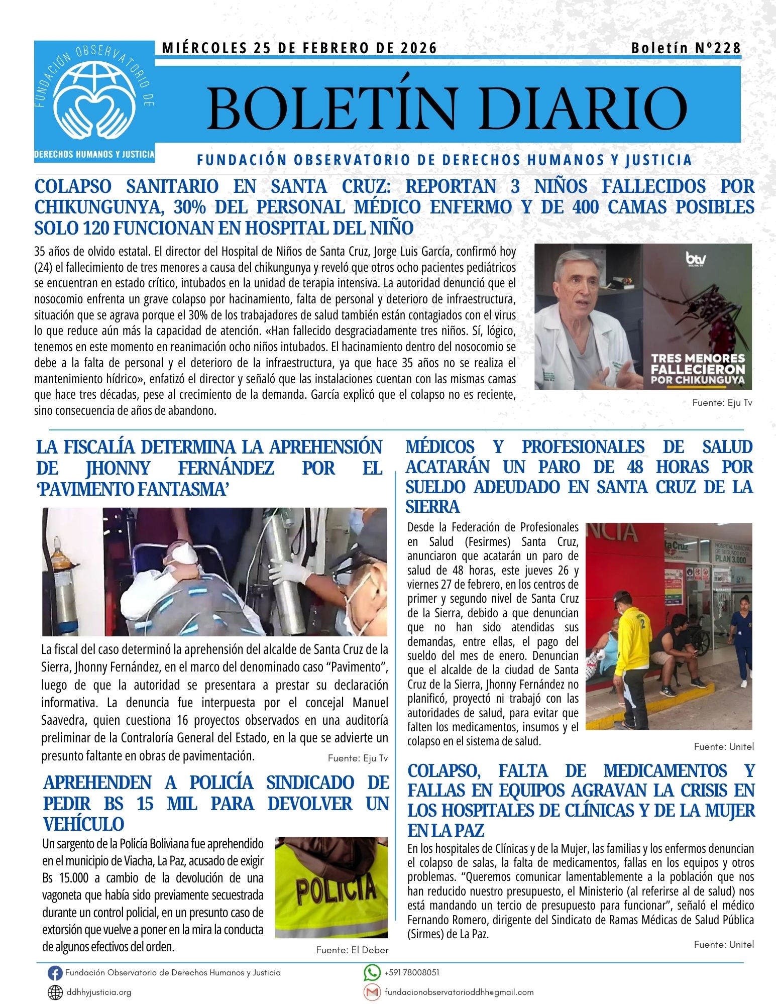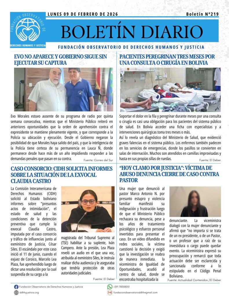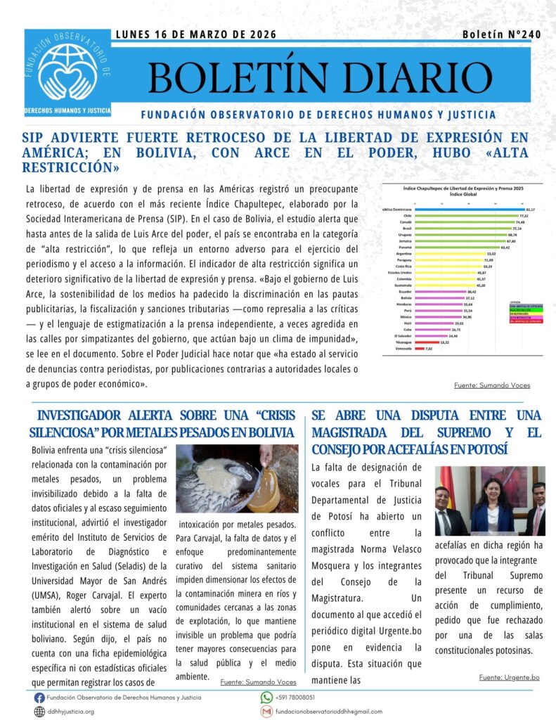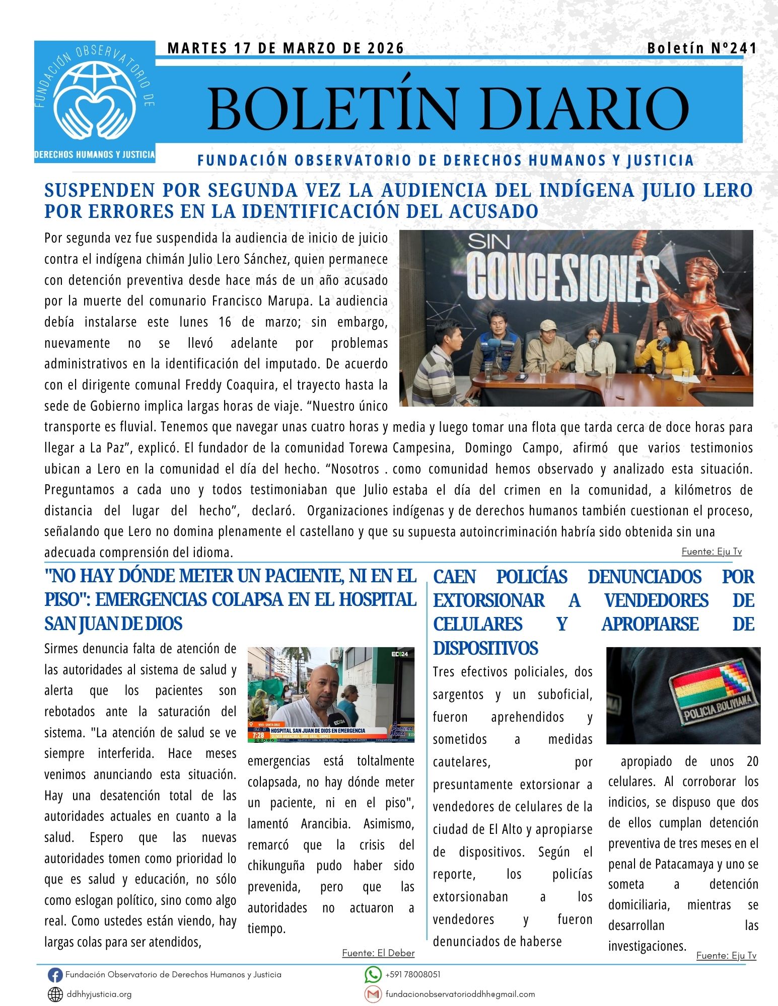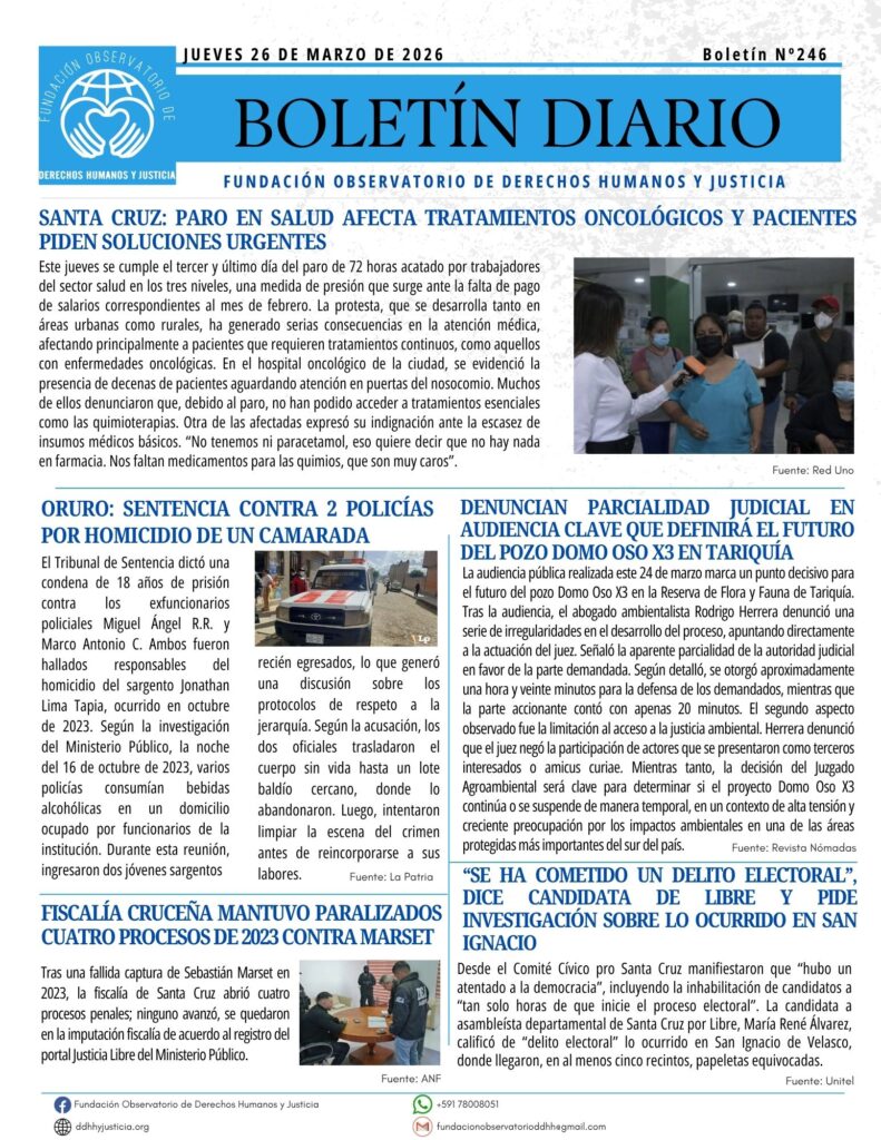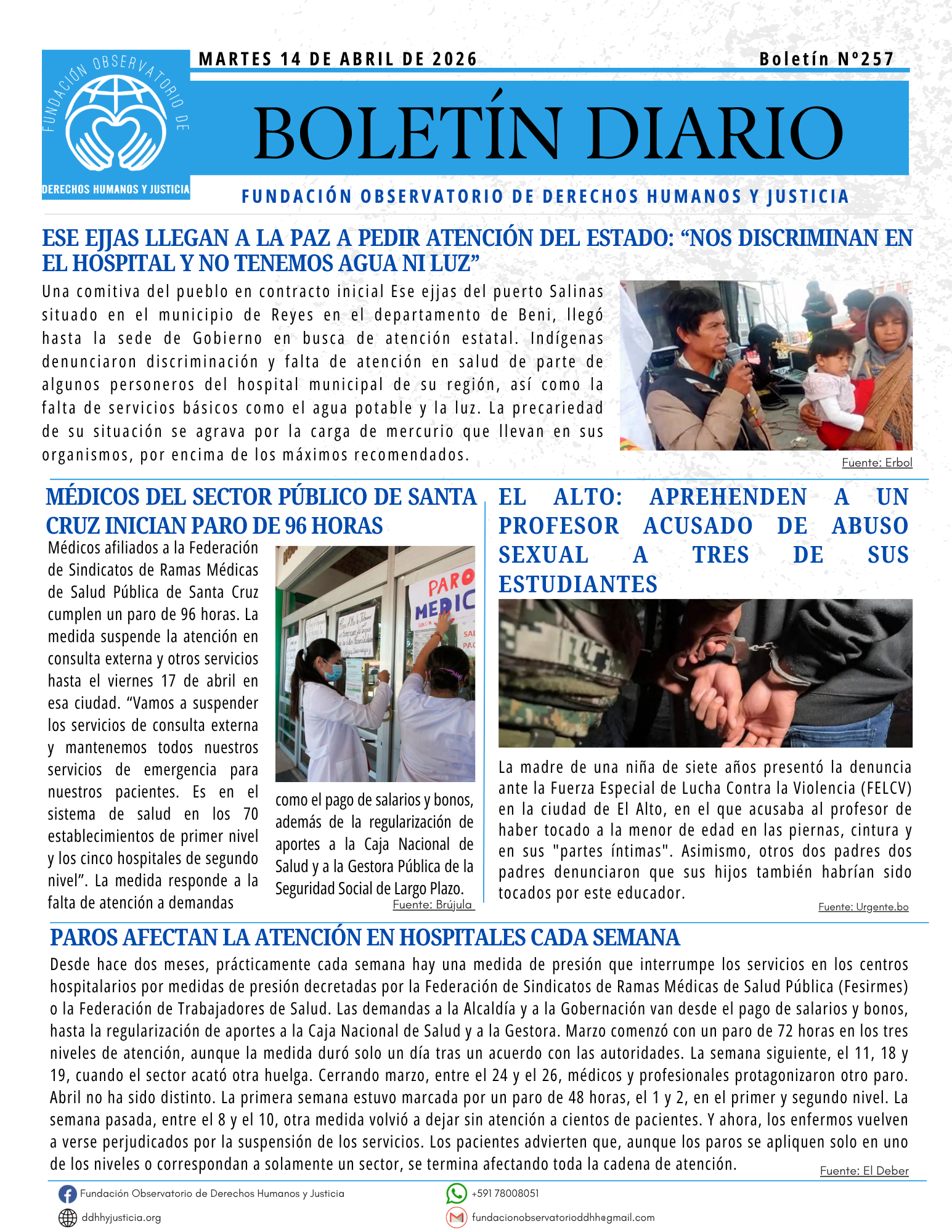 Desarrollamos nuestras actividades para que las frecuentes denuncias de violaciones de derechos humanos conocidas a través de diversos medios de prensa e instituciones que tienen los mismos objetivos, puedan visibilizarse y denunciarse. Para ello llevamos adelante un trabajo de monitoreo, investigación, observación y formación en derechos humanos, que nos permite conocer el estado real de la observancia y respeto de los derechos civiles y políticos en Bolivia.