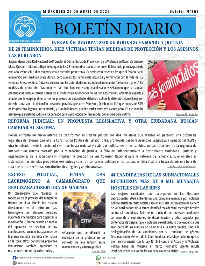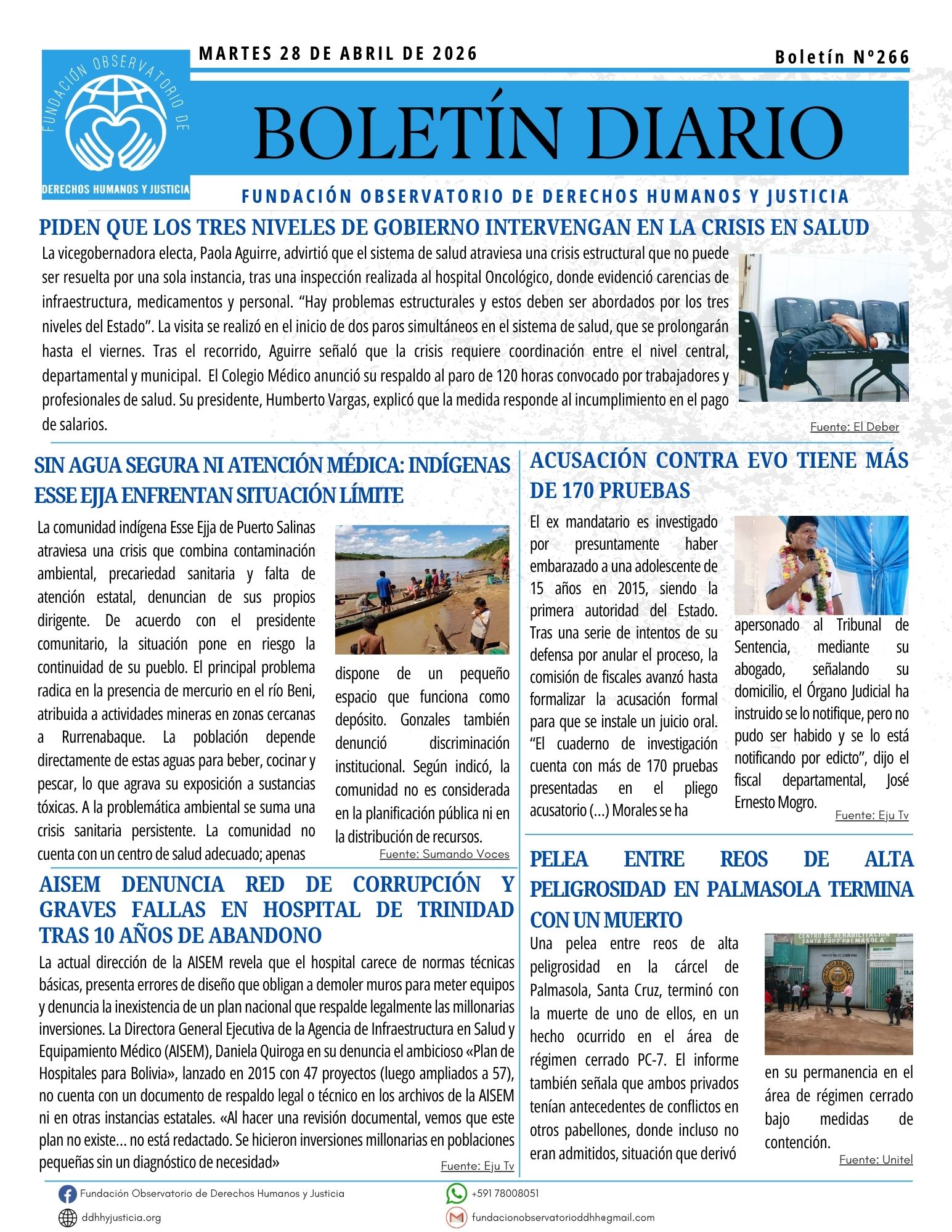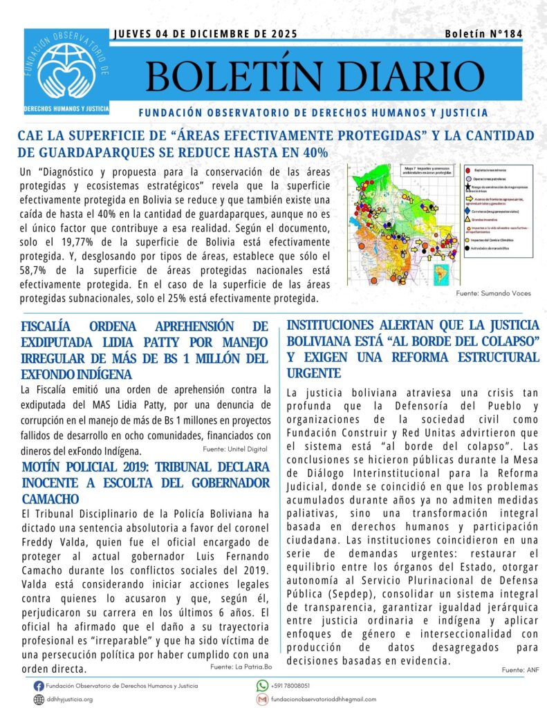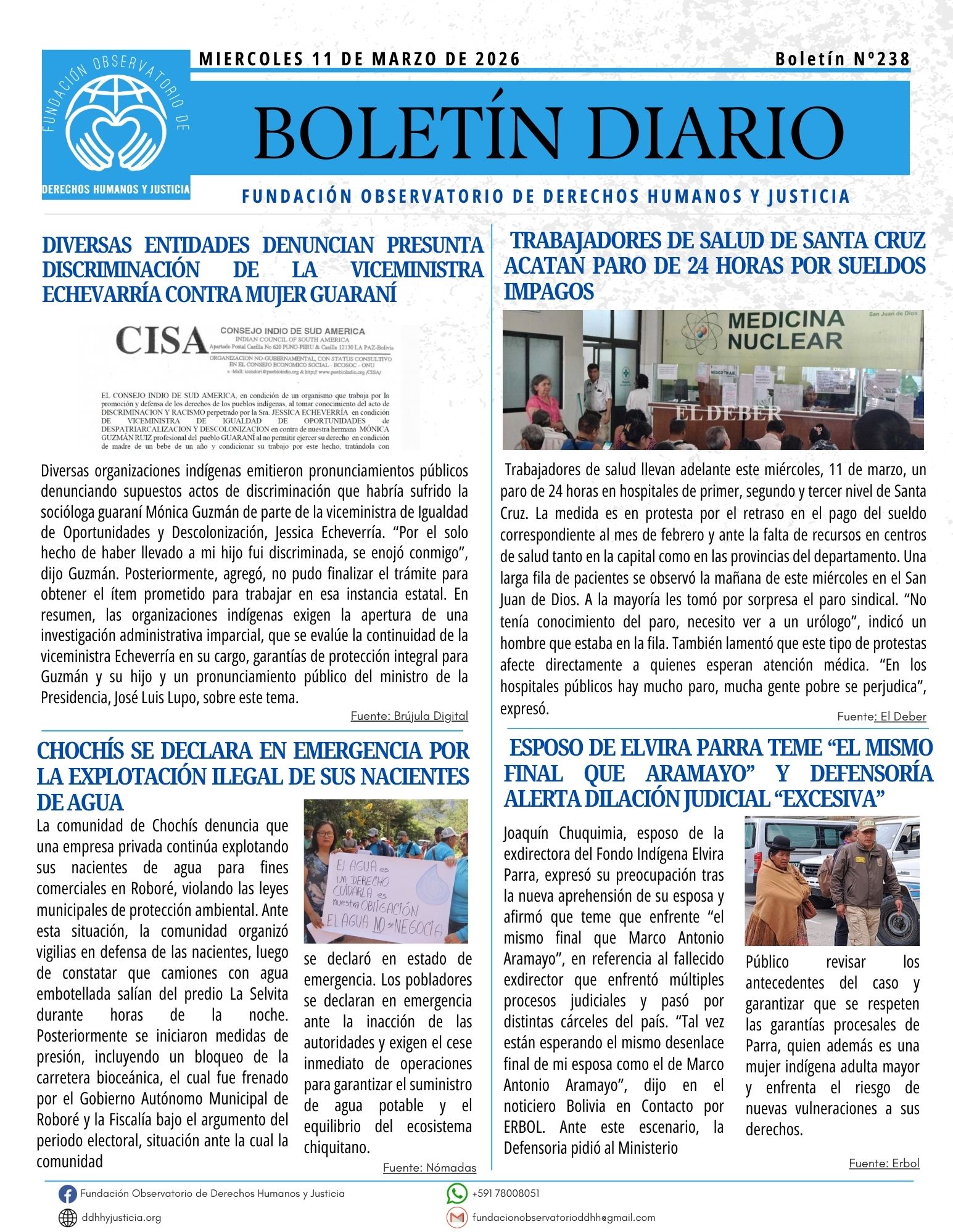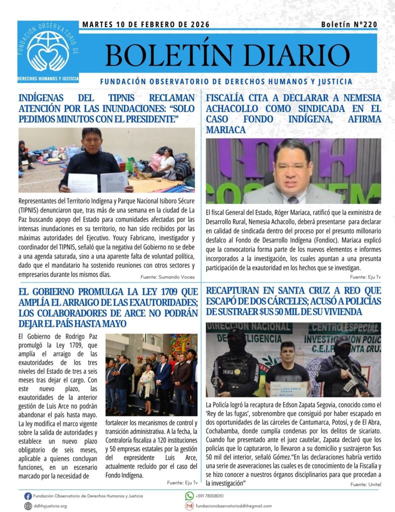 Desarrollamos nuestras actividades para que las frecuentes denuncias de violaciones de derechos humanos conocidas a través de diversos medios de prensa e instituciones que tienen los mismos objetivos, puedan visibilizarse y denunciarse. Para ello llevamos adelante un trabajo de monitoreo, investigación, observación y formación en derechos humanos, que nos permite conocer el estado real de la observancia y respeto de los derechos civiles y políticos en Bolivia.