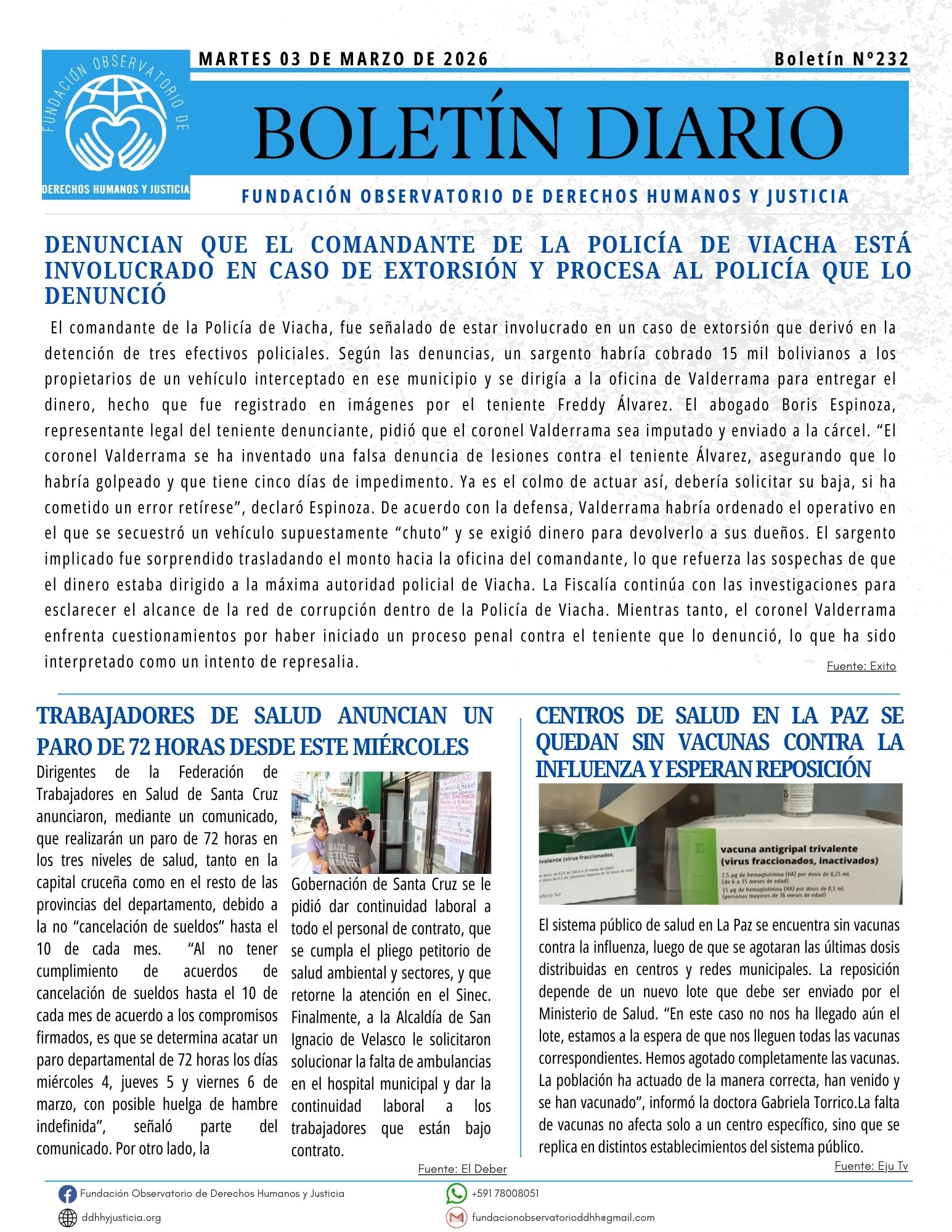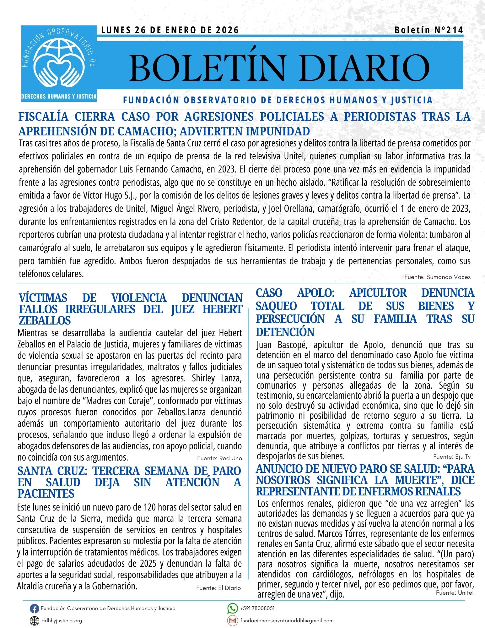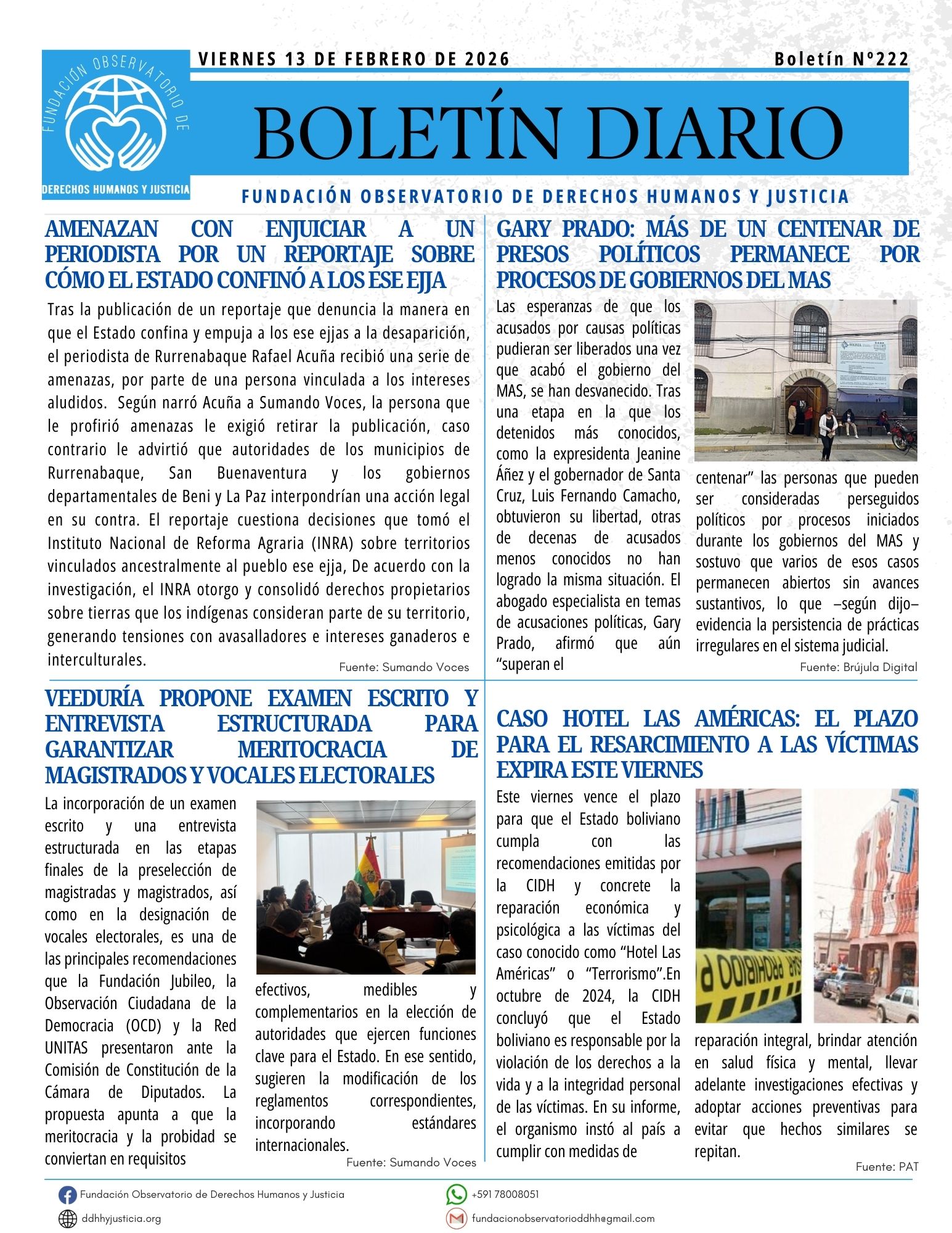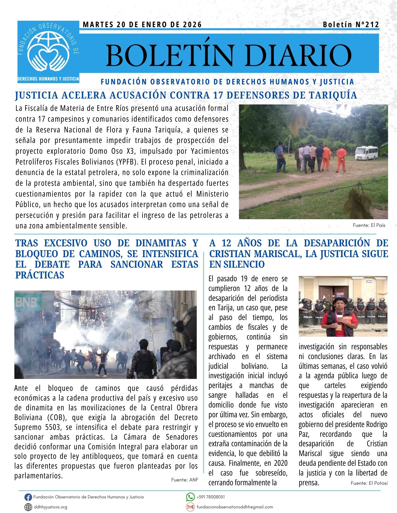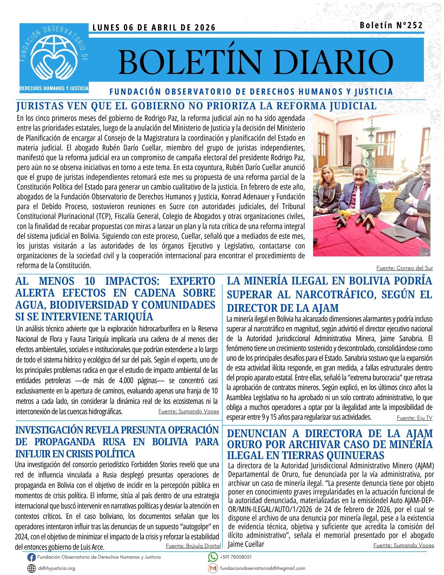 Desarrollamos nuestras actividades para que las frecuentes denuncias de violaciones de derechos humanos conocidas a través de diversos medios de prensa e instituciones que tienen los mismos objetivos, puedan visibilizarse y denunciarse. Para ello llevamos adelante un trabajo de monitoreo, investigación, observación y formación en derechos humanos, que nos permite conocer el estado real de la observancia y respeto de los derechos civiles y políticos en Bolivia.