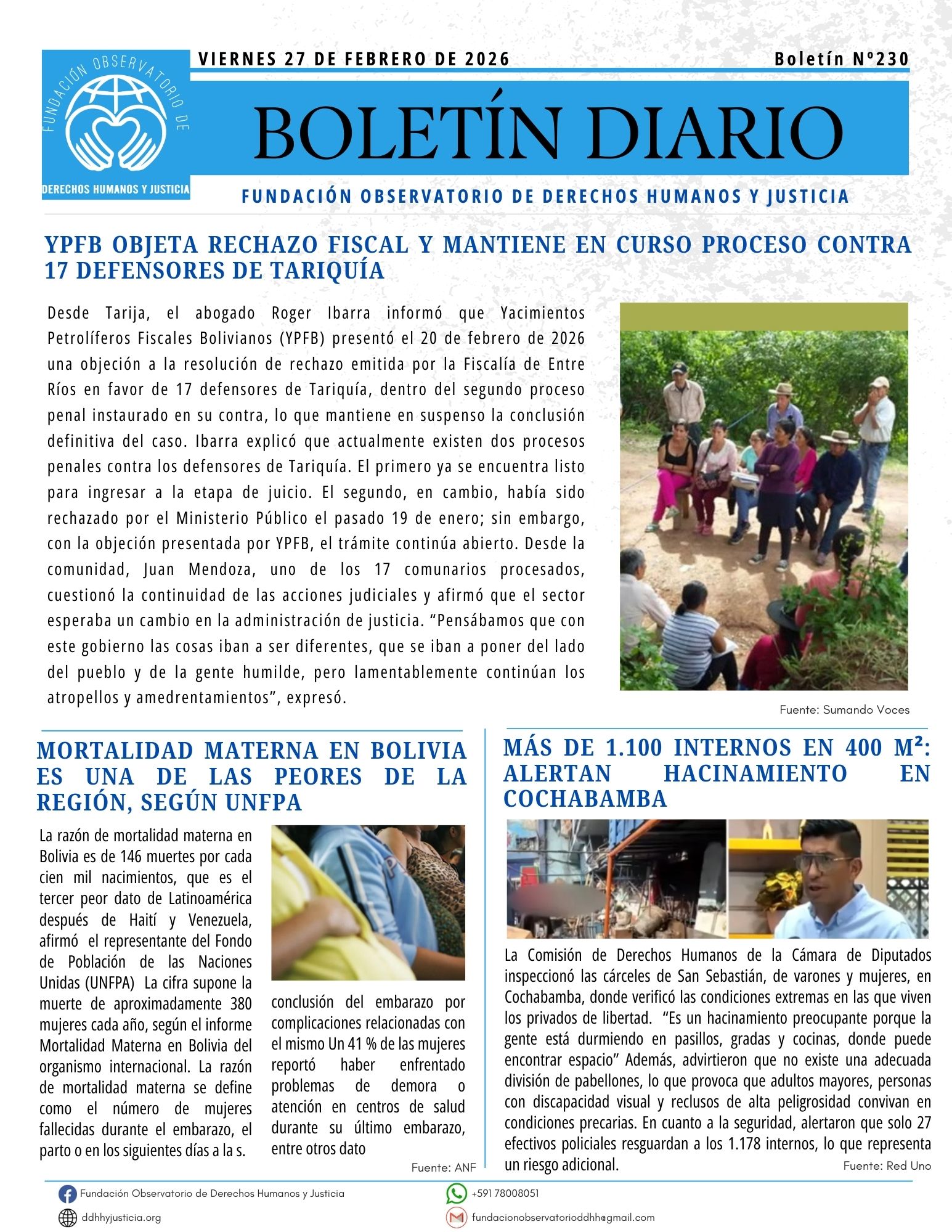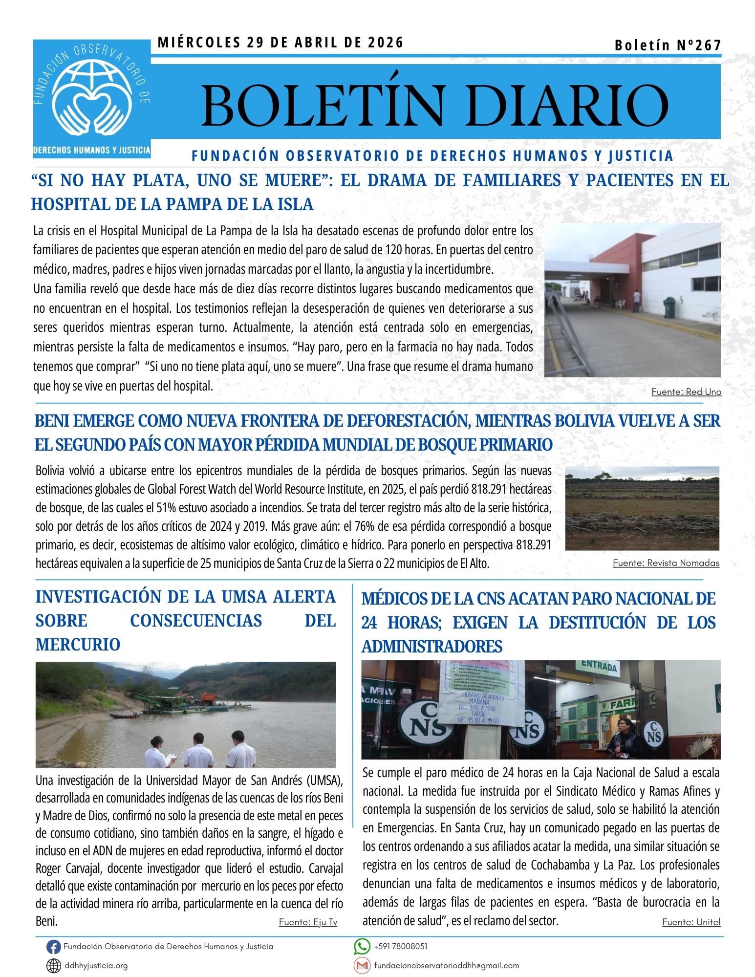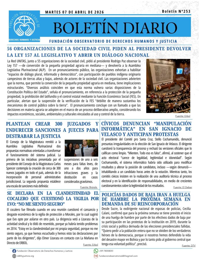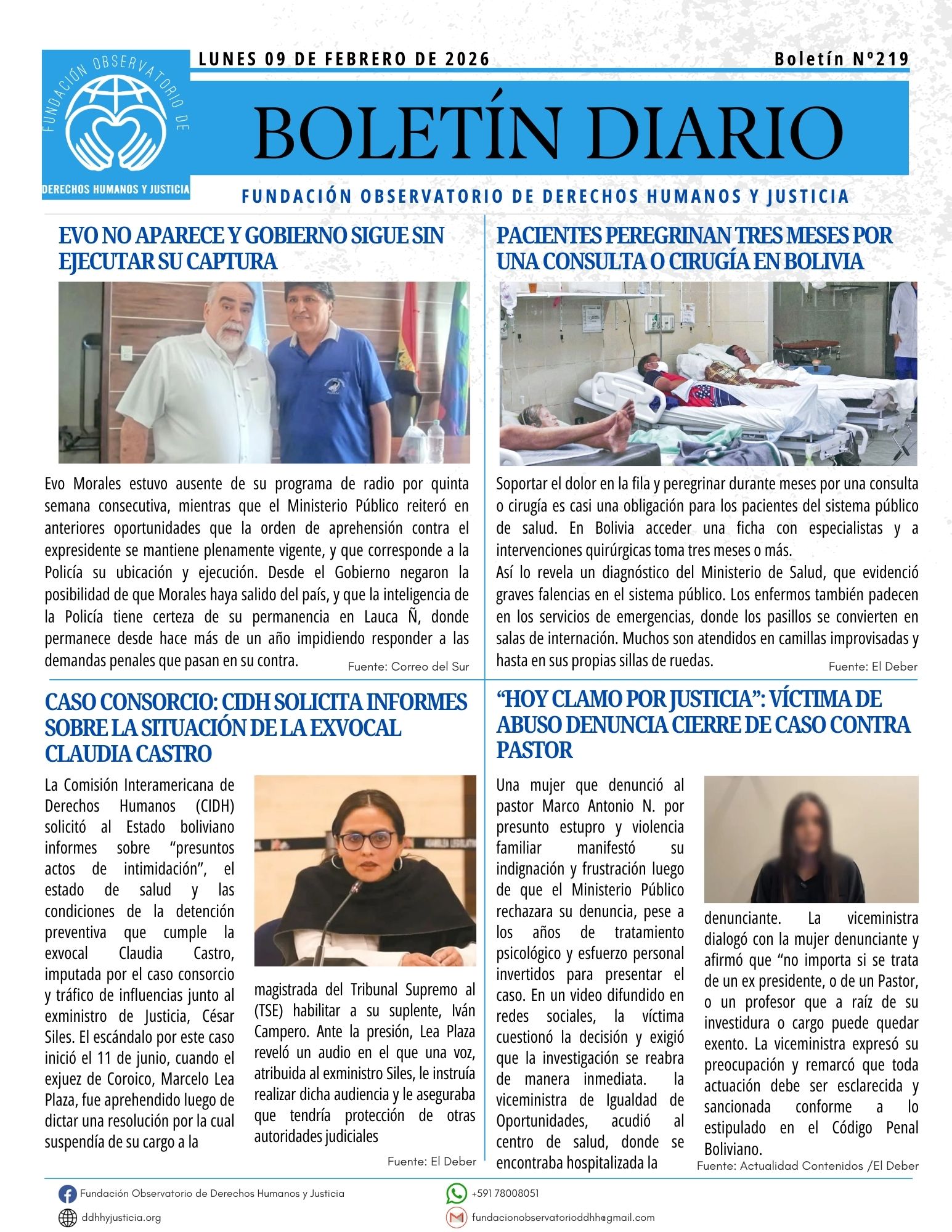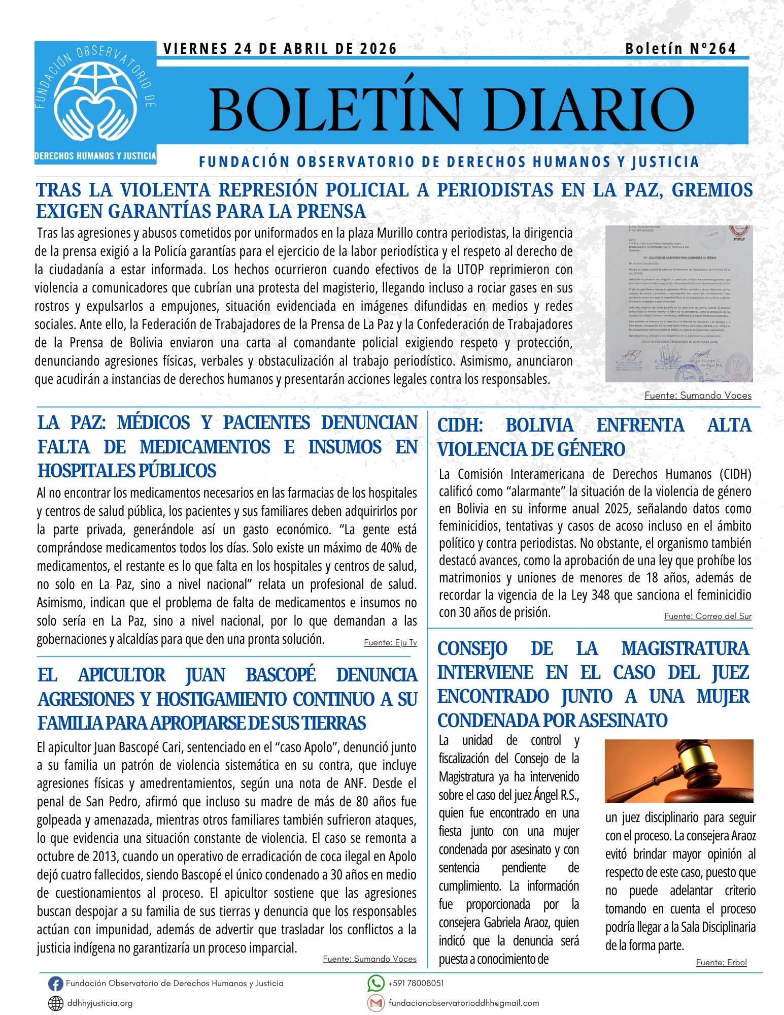 Desarrollamos nuestras actividades para que las frecuentes denuncias de violaciones de derechos humanos conocidas a través de diversos medios de prensa e instituciones que tienen los mismos objetivos, puedan visibilizarse y denunciarse. Para ello llevamos adelante un trabajo de monitoreo, investigación, observación y formación en derechos humanos, que nos permite conocer el estado real de la observancia y respeto de los derechos civiles y políticos en Bolivia.