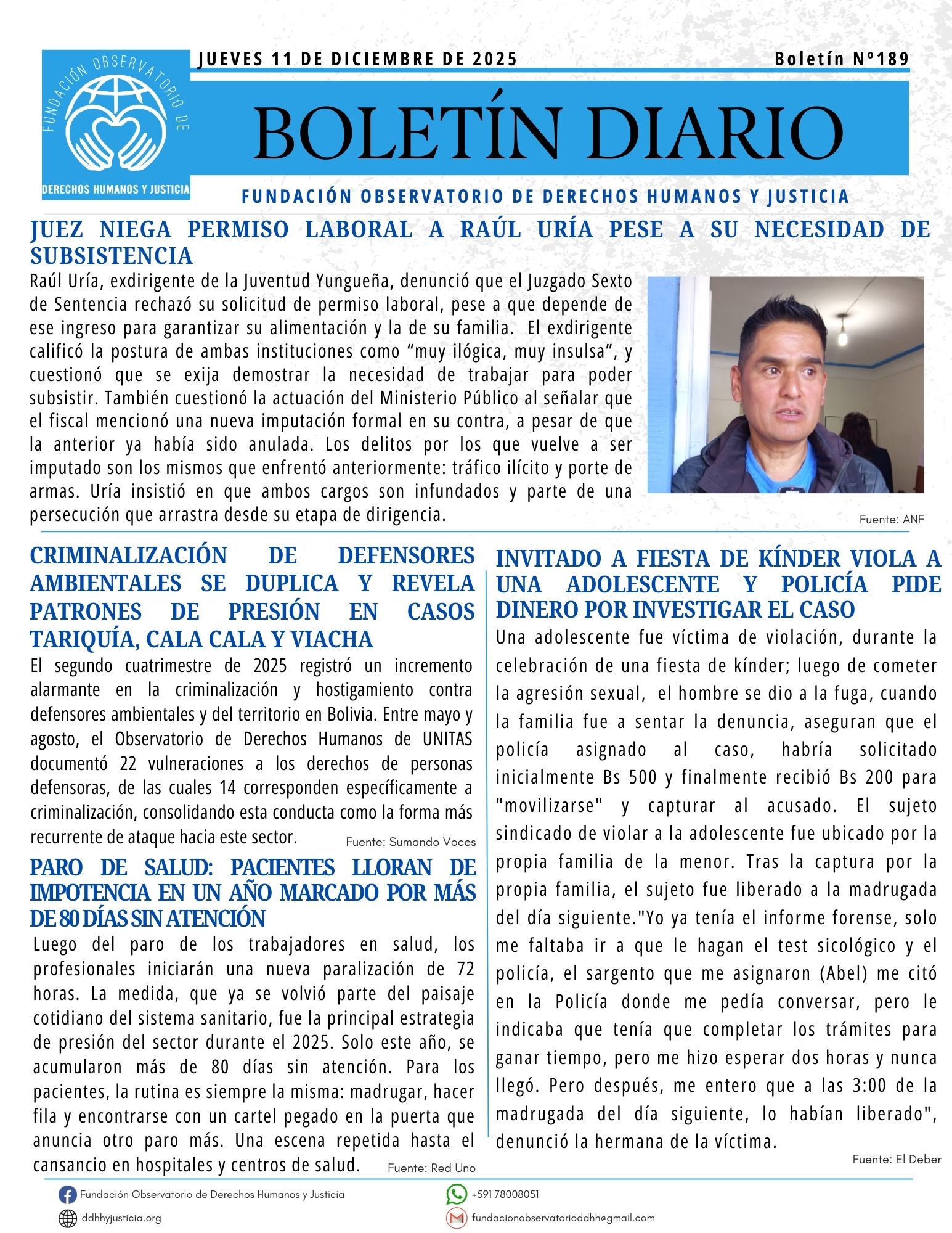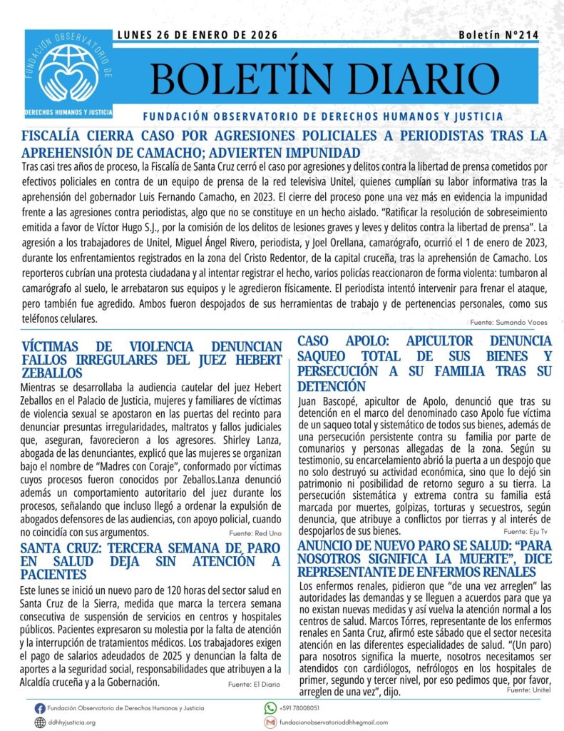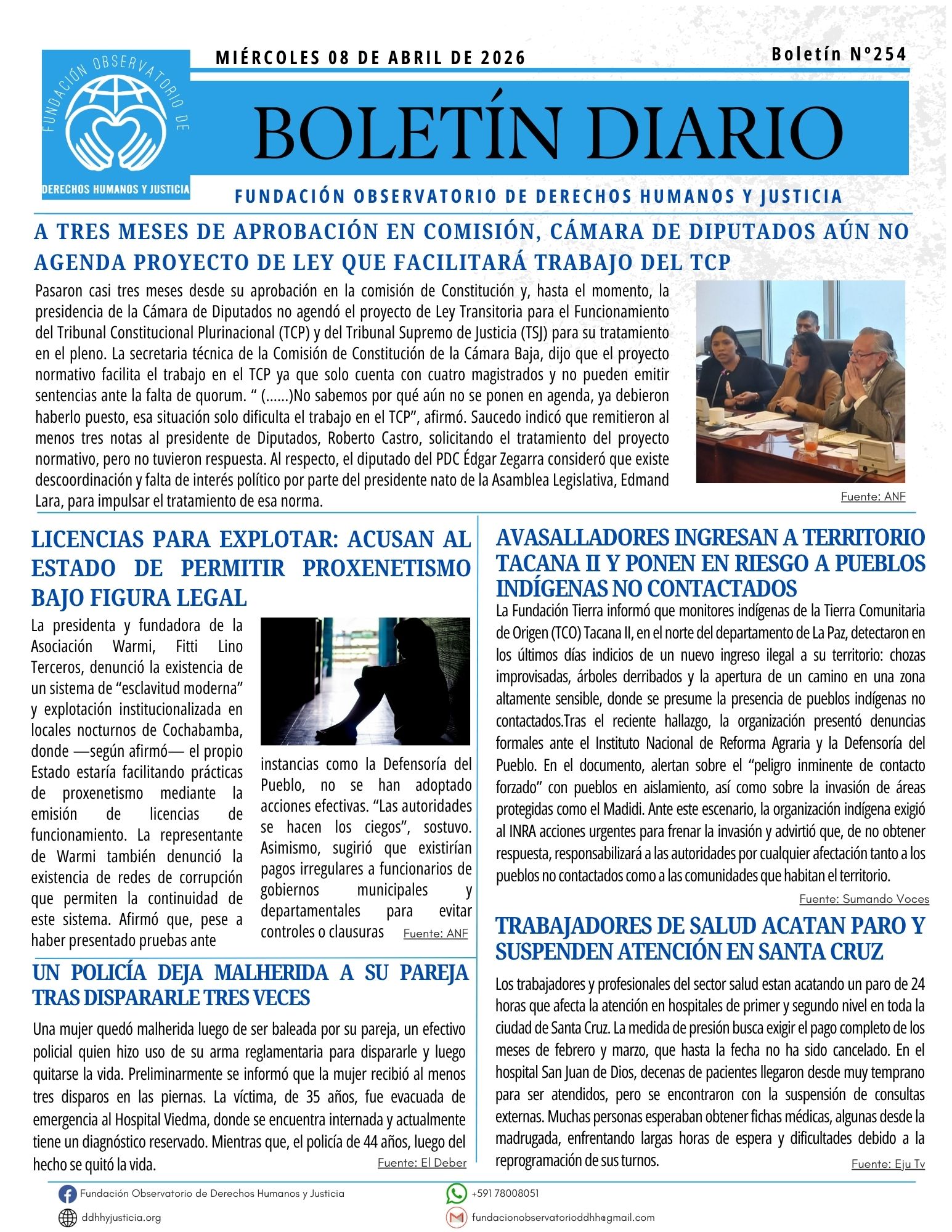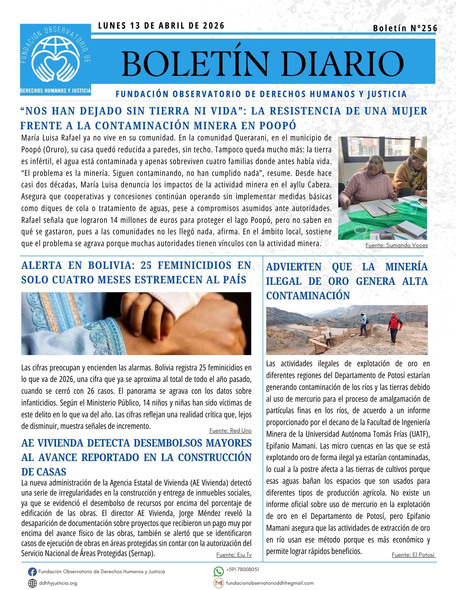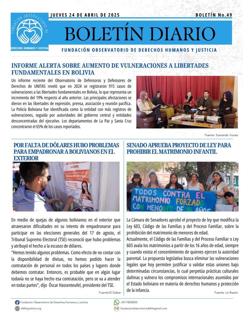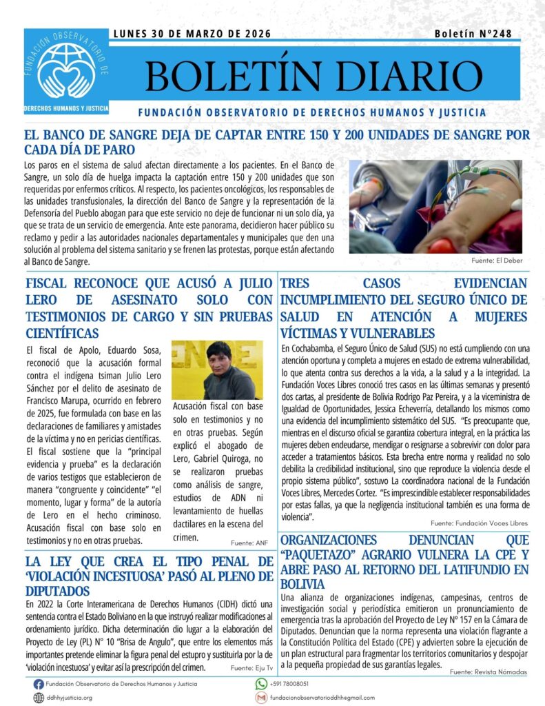 Desarrollamos nuestras actividades para que las frecuentes denuncias de violaciones de derechos humanos conocidas a través de diversos medios de prensa e instituciones que tienen los mismos objetivos, puedan visibilizarse y denunciarse. Para ello llevamos adelante un trabajo de monitoreo, investigación, observación y formación en derechos humanos, que nos permite conocer el estado real de la observancia y respeto de los derechos civiles y políticos en Bolivia.