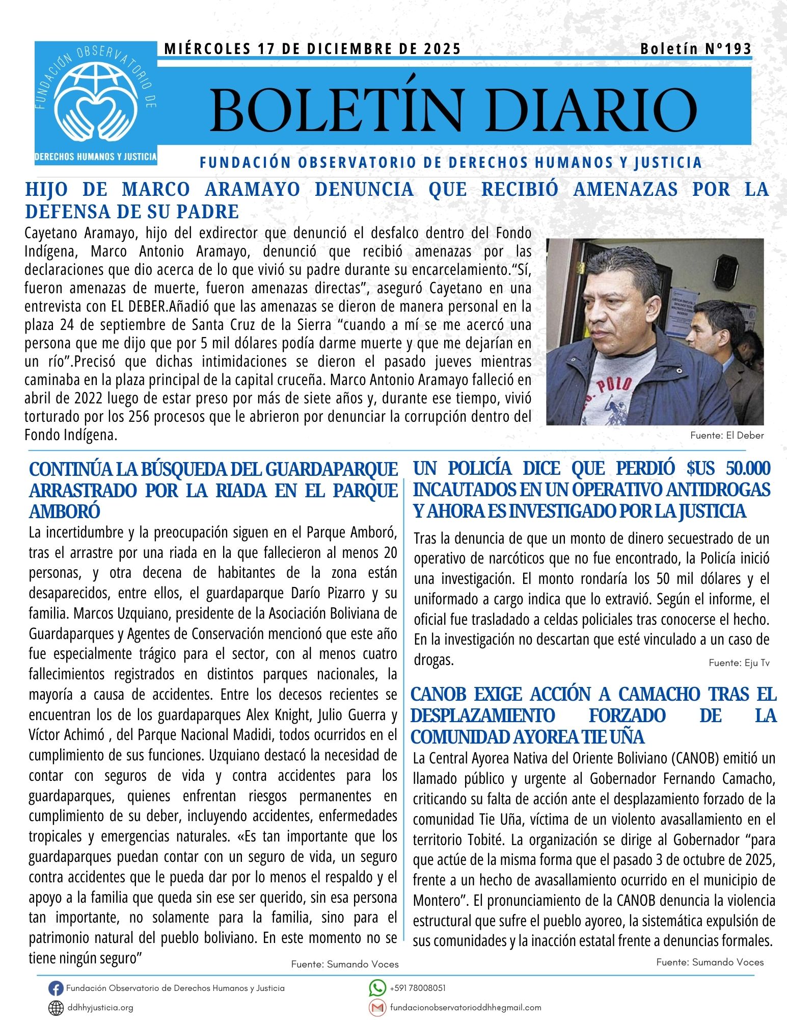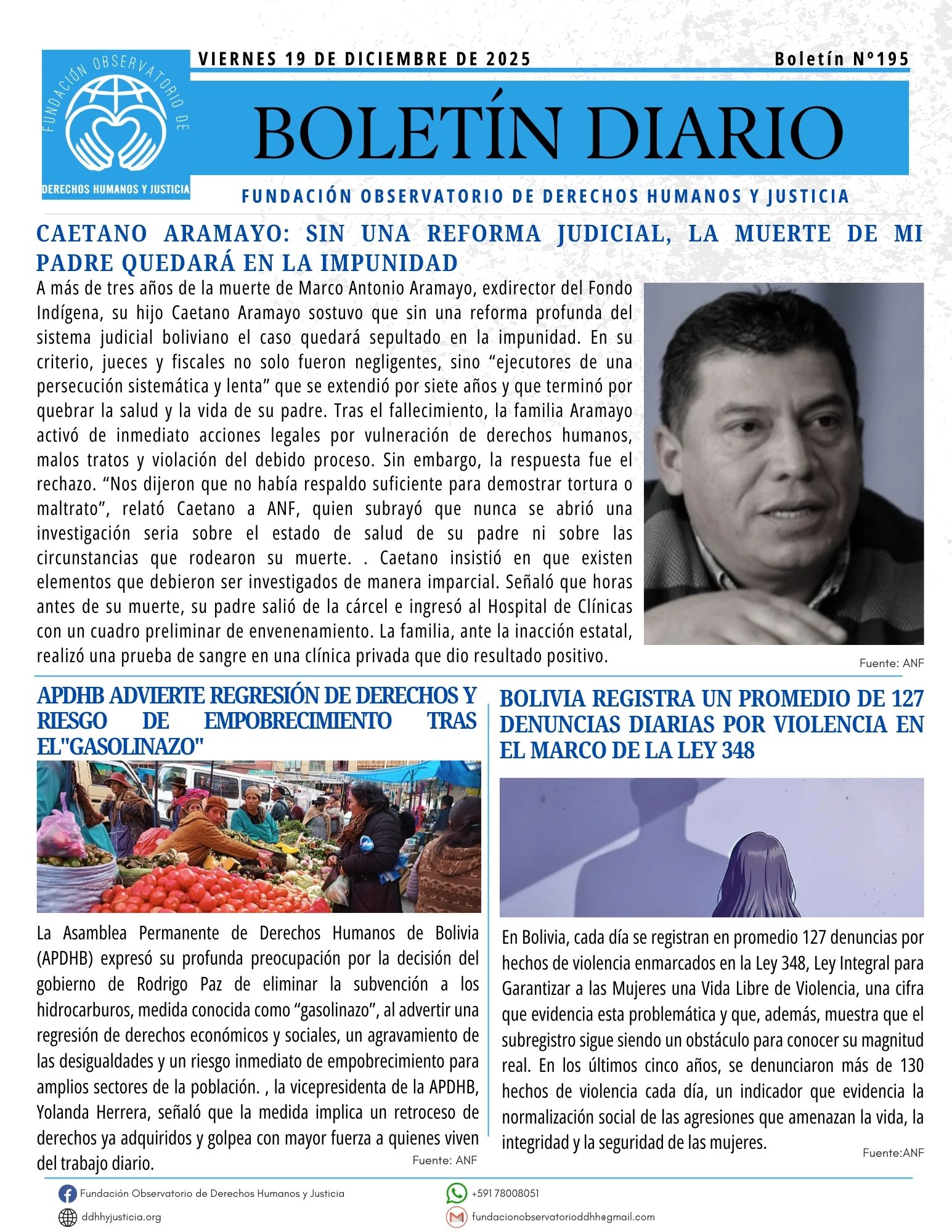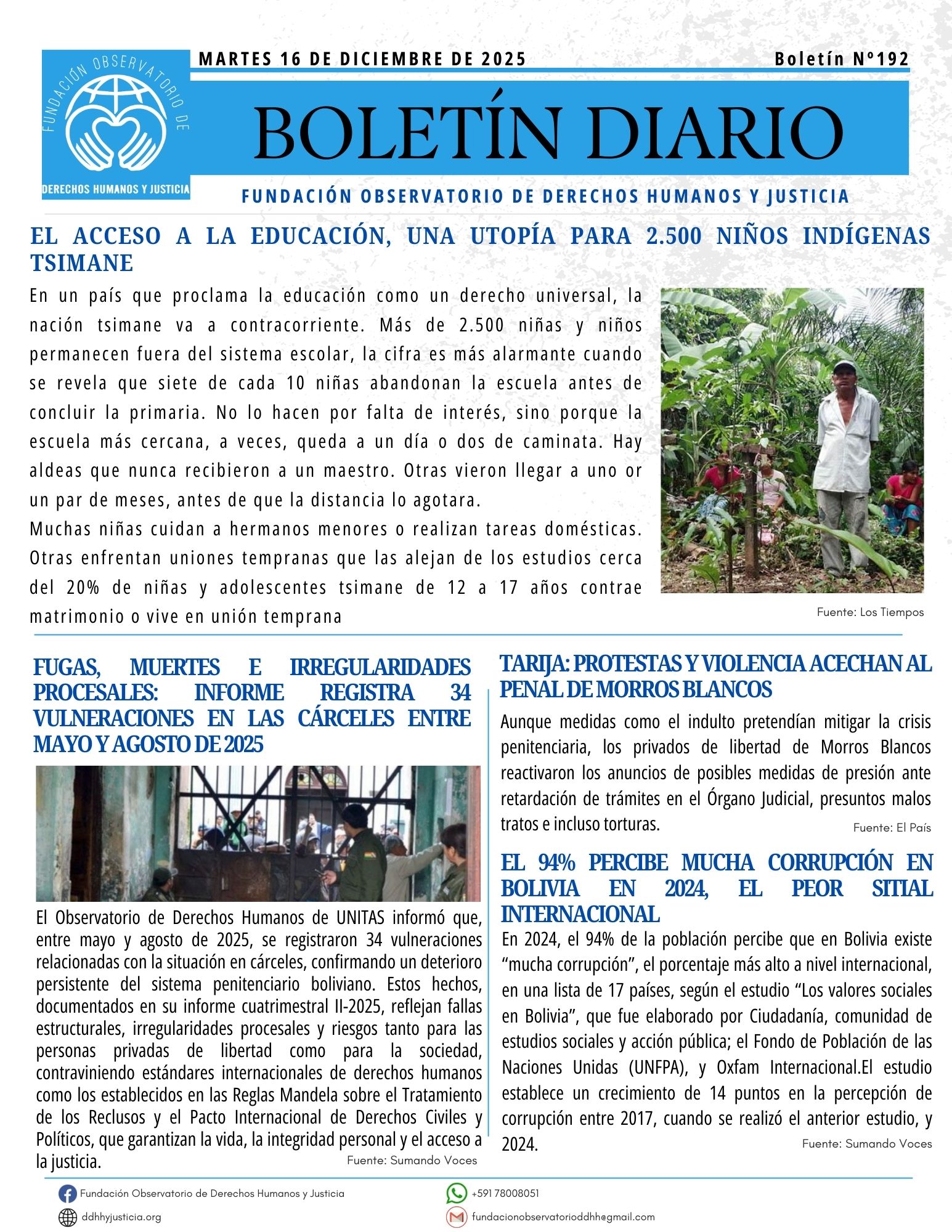 Desarrollamos nuestras actividades para que las frecuentes denuncias de violaciones de derechos humanos conocidas a través de diversos medios de prensa e instituciones que tienen los mismos objetivos, puedan visibilizarse y denunciarse. Para ello llevamos adelante un trabajo de monitoreo, investigación, observación y formación en derechos humanos, que nos permite conocer el estado real de la observancia y respeto de los derechos civiles y políticos en Bolivia.