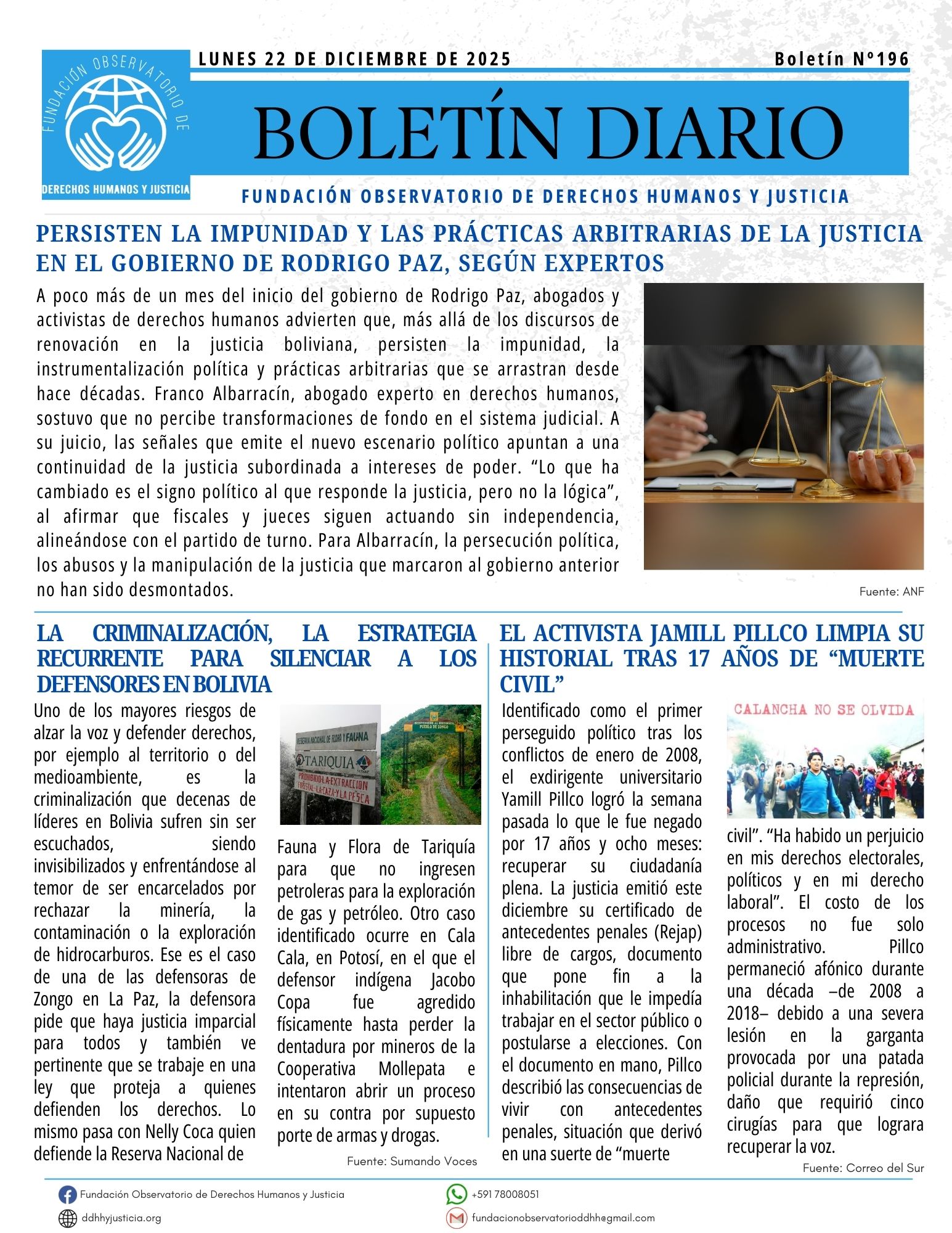 Desarrollamos nuestras actividades para que las frecuentes denuncias de violaciones de derechos humanos conocidas a través de diversos medios de prensa e instituciones que tienen los mismos objetivos, puedan visibilizarse y denunciarse. Para ello llevamos adelante un trabajo de monitoreo, investigación, observación y formación en derechos humanos, que nos permite conocer el estado real de la observancia y respeto de los derechos civiles y políticos en Bolivia.