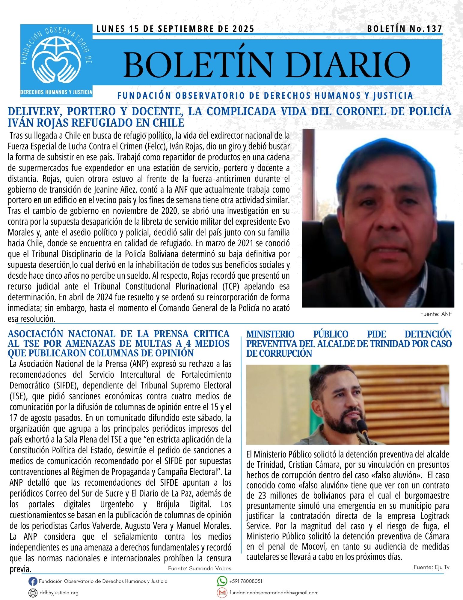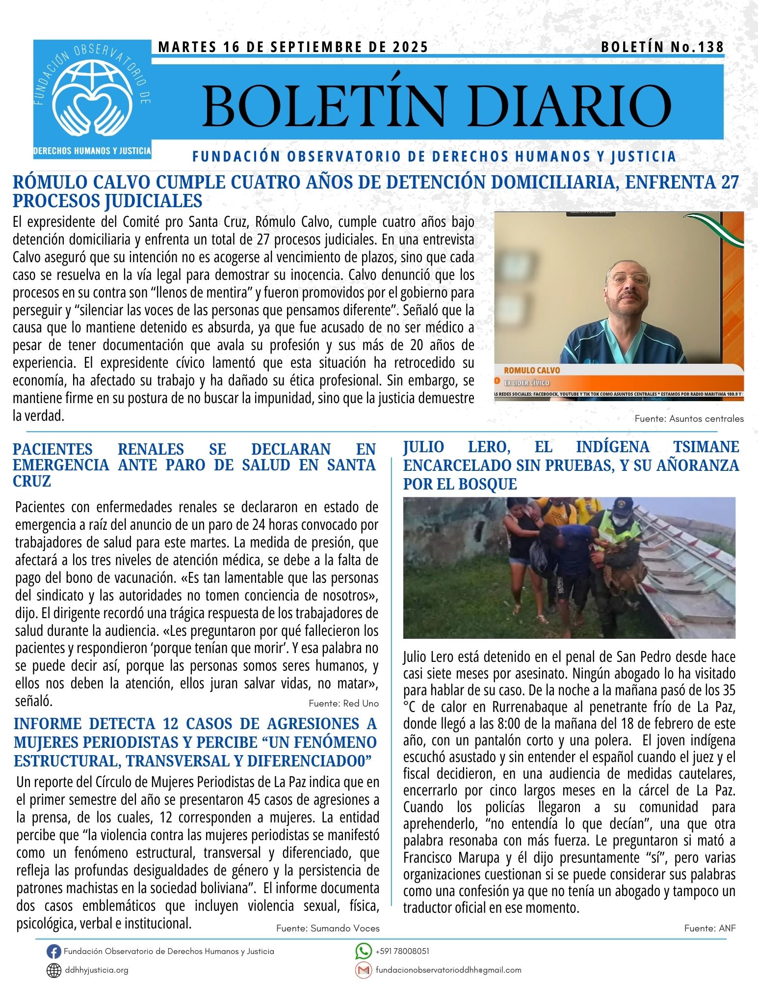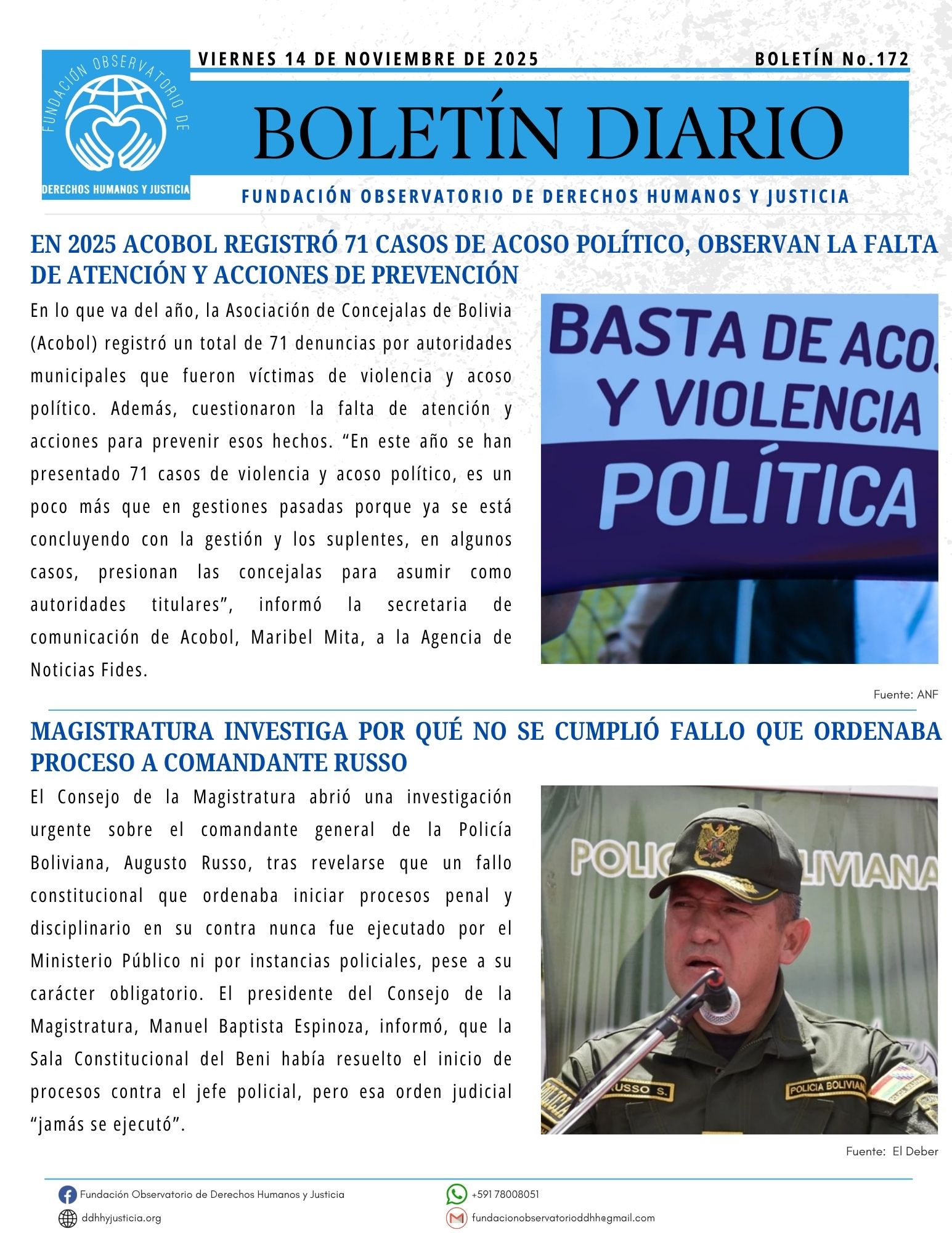 Desarrollamos nuestras actividades para que las frecuentes denuncias de violaciones de derechos humanos conocidas a través de diversos medios de prensa e instituciones que tienen los mismos objetivos, puedan visibilizarse y denunciarse. Para ello llevamos adelante un trabajo de monitoreo, investigación, observación y formación en derechos humanos, que nos permite conocer el estado real de la observancia y respeto de los derechos civiles y políticos en Bolivia.